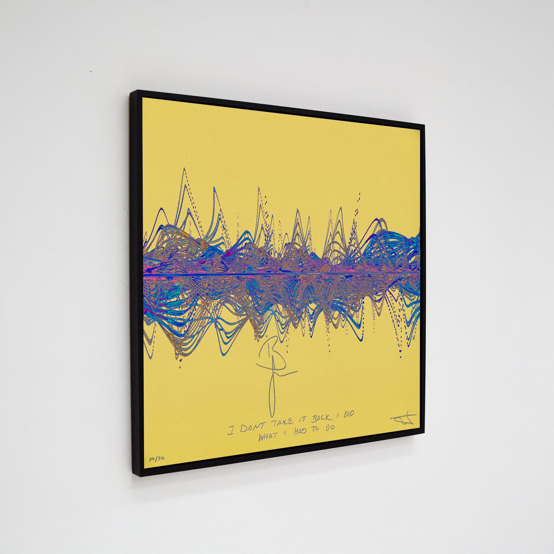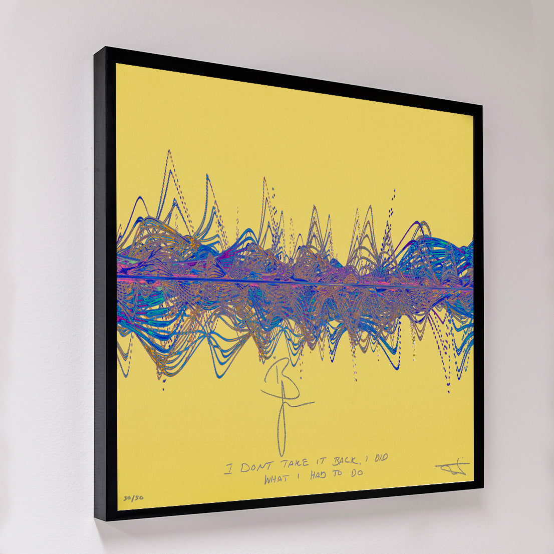 Our Originals measure 38″ x 38″ and often feature a lyric or the title of the song written by the artist in addition to their signature. These are much more limited edition – there is only one Original created per design. Originals sometimes come in alternate color palettes or wave designs to the prints.