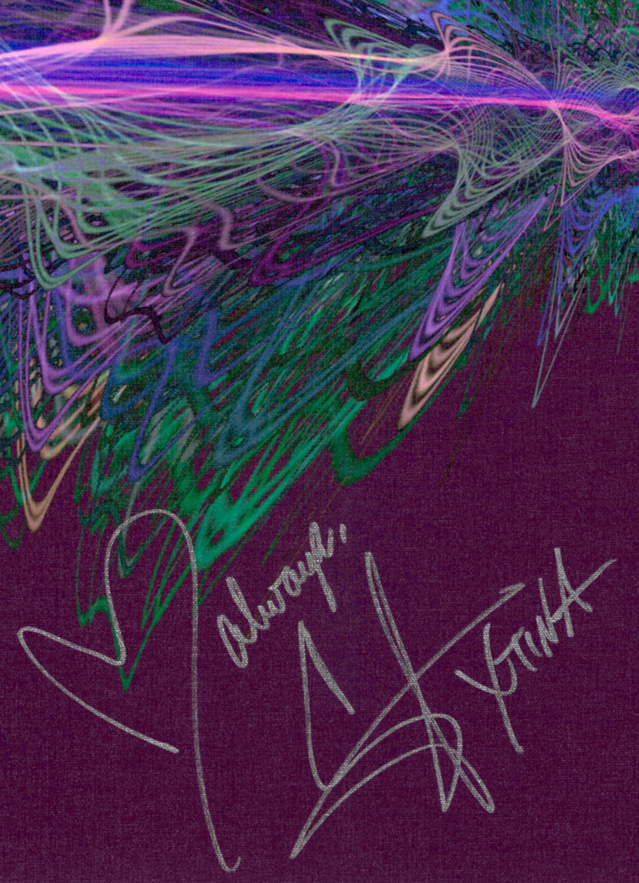 Our Originals measure 38″ x 38″ and often feature a lyric or the title of the song written by the artist in addition to their signature. These are much more limited edition – there is only one Original created per design. Originals sometimes come in alternate color palettes or wave designs to the prints.