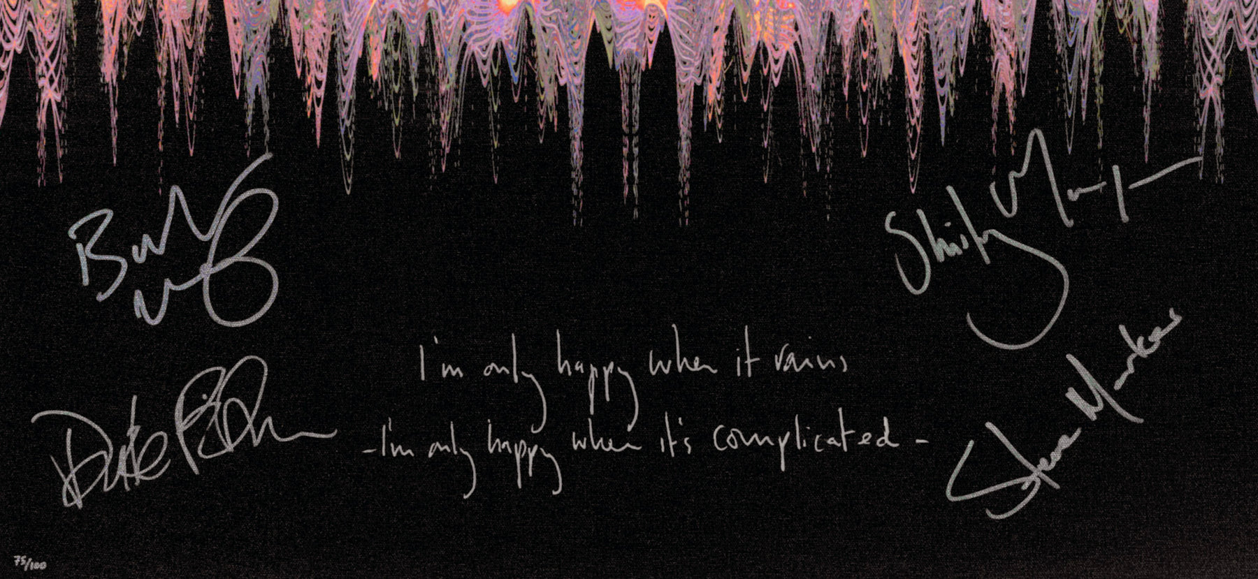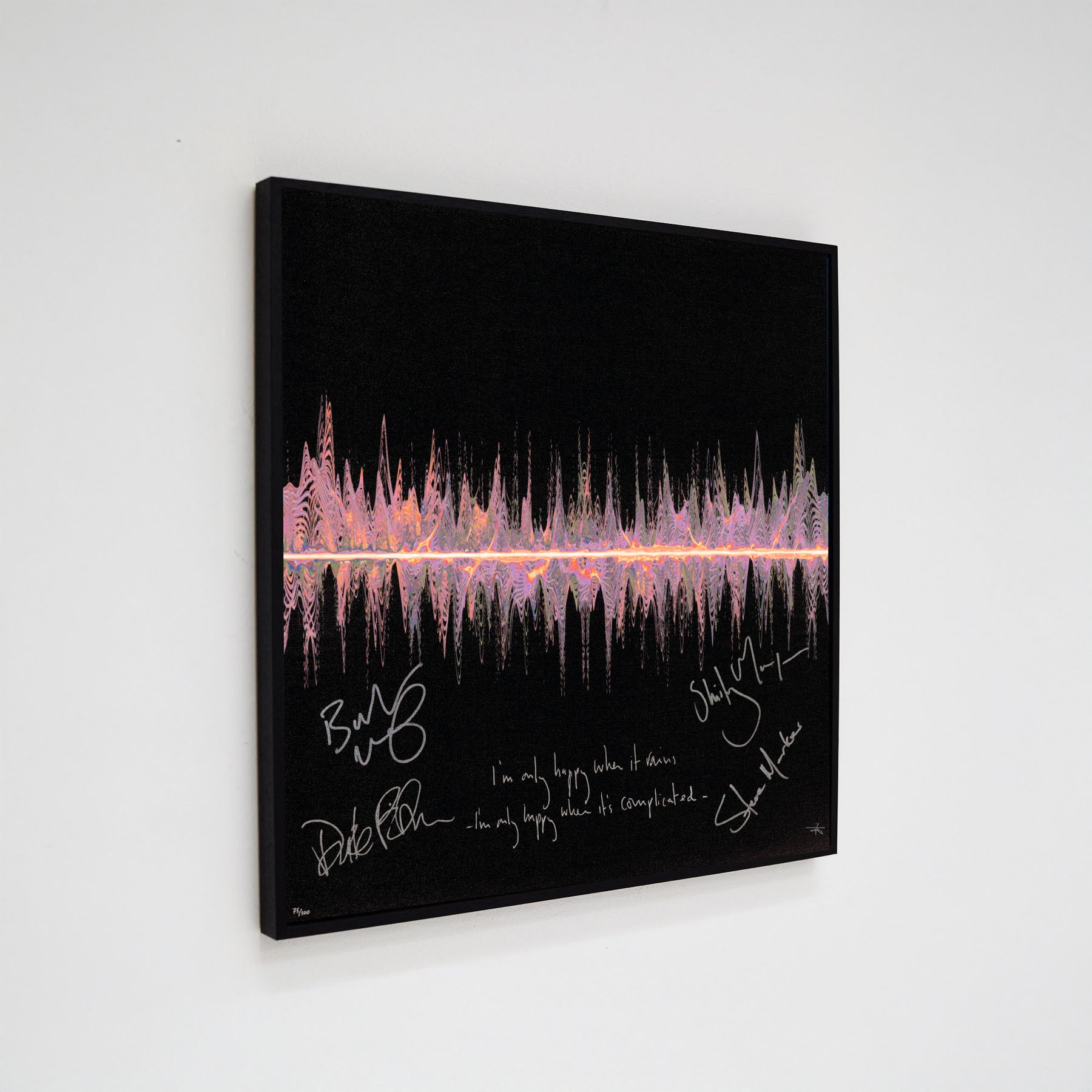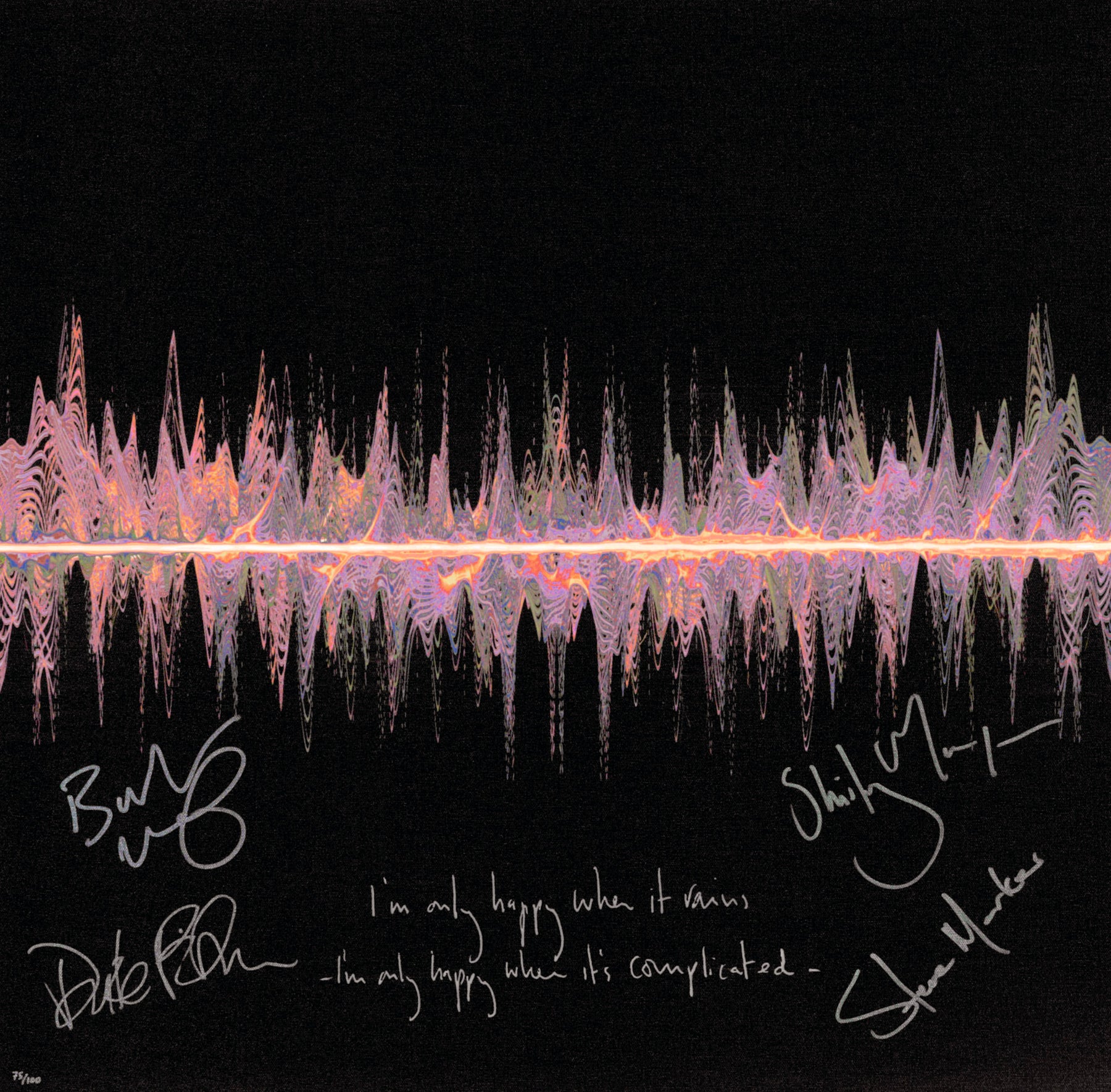 Limited edition artwork created from the audio recording of Garbage's "Only Happy When It Rains," their breakthrough single. The band signed this print in Austin, TX in June 2023.