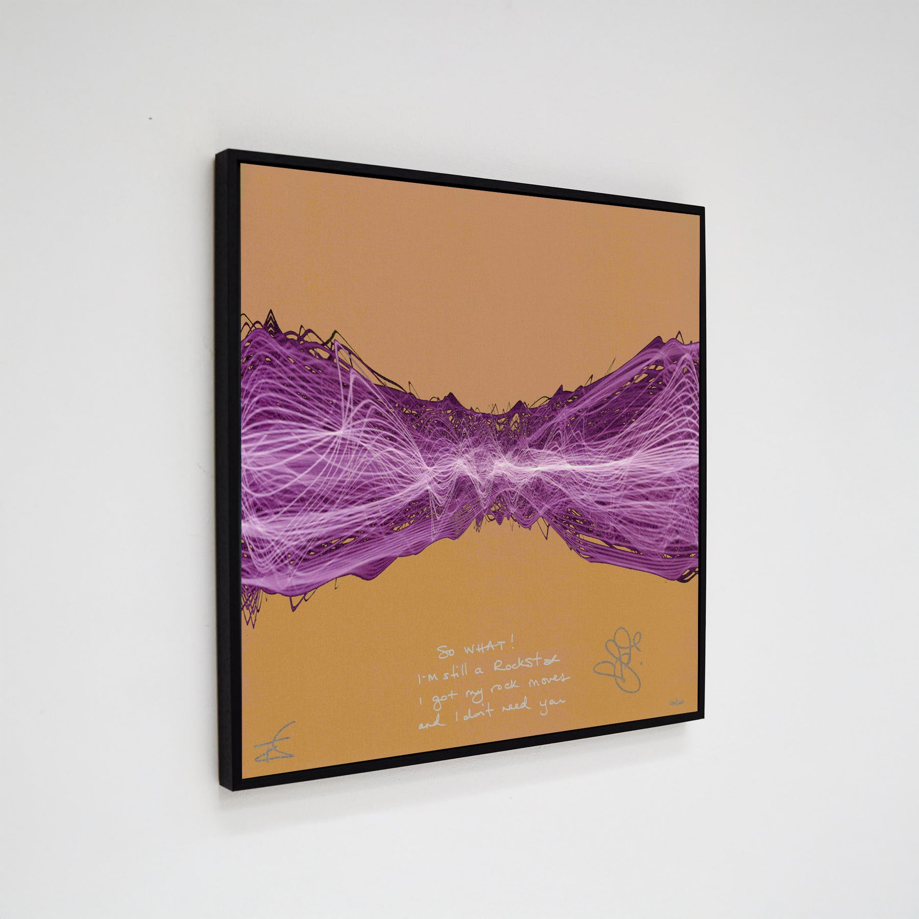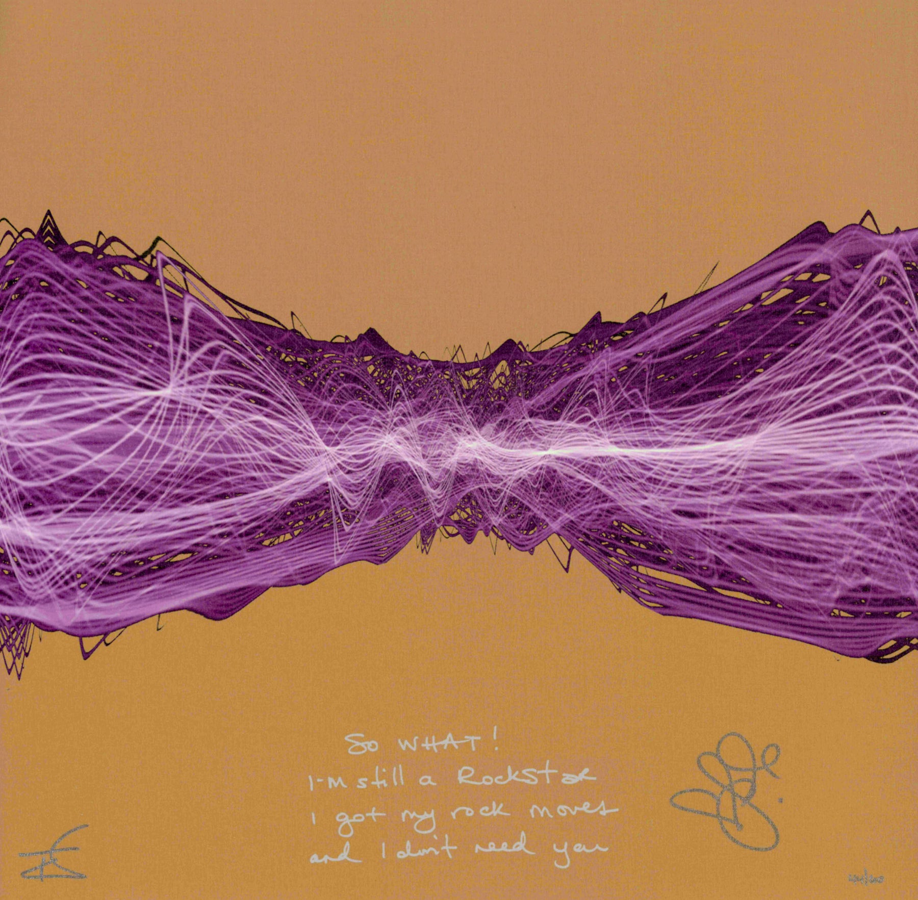Limited edition Soundwaves artwork made from the sound waves of P!nk's 2008 #1 hit, "So What." P!nk hand-signed this print while on her Summer Carnival tour throughout North America in 2024.  This is the second-edition of this artwork, as the first-edition sold out immediately in 2022 upon release.