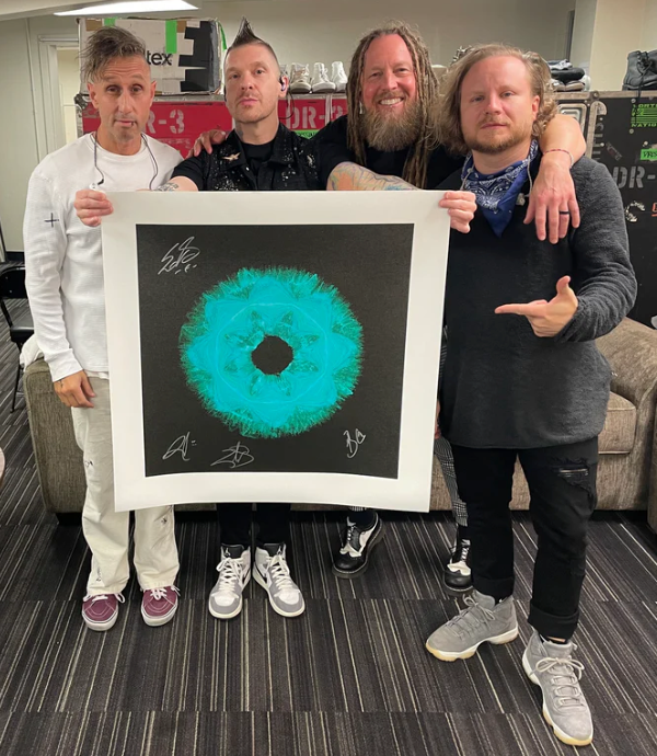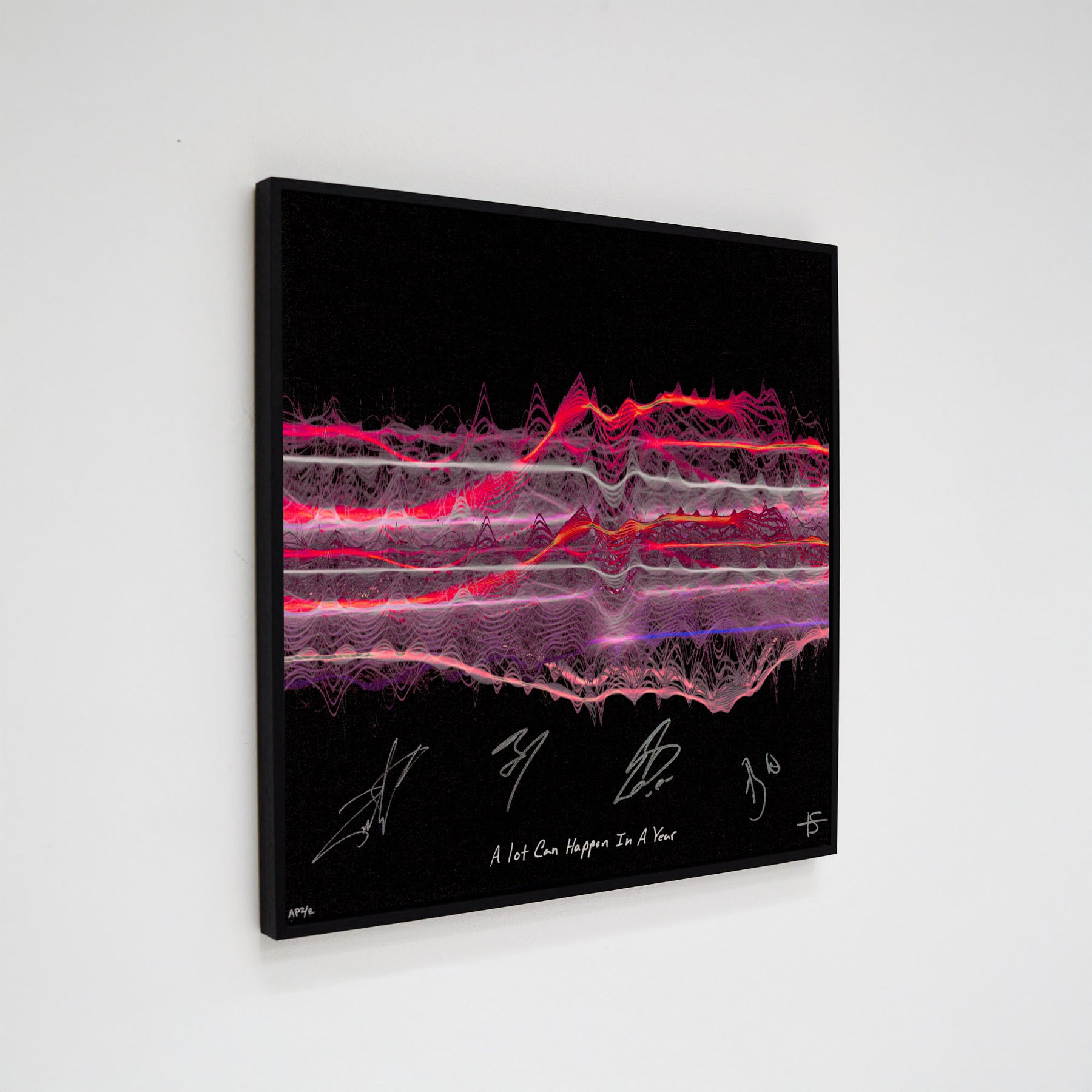 Limited-edition Soundwaves Artwork created from the sound waves of Shinedown's "Three Six Five." The band hand-signed this print backstage before their concert at Toyota Center in Houston, Texas on August 27, 2025.