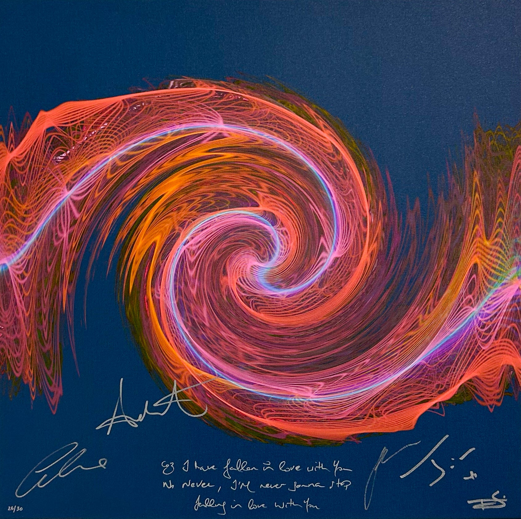 Limited-edition Soundwaves Artwork created from the audio of The Corrs' "Runaway.Andrea, Sharon, Caroline and Jim Corr hand-signed this artwork before their show at the O2 in London on November 20, 2024.