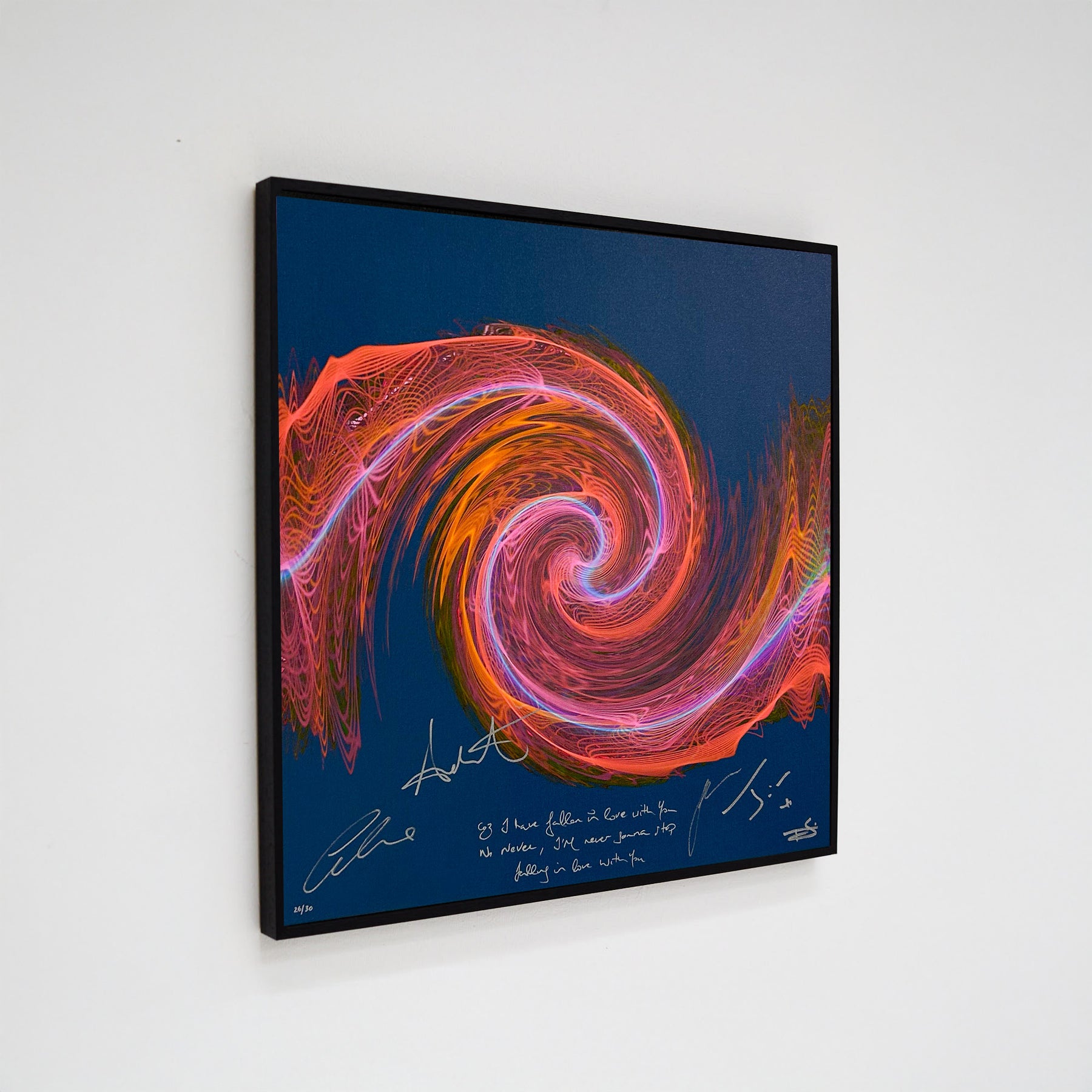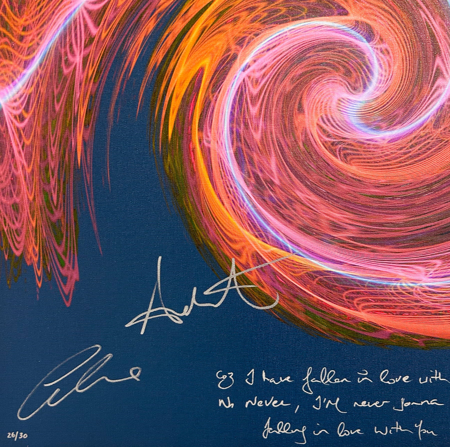 Our Originals measure 38″ x 38″ and often feature a lyric or the title of the song written by the artist in addition to their signature. These are much more limited edition – there is only one Original created per design. Originals sometimes come in alternate color palettes or wave designs to the prints.
