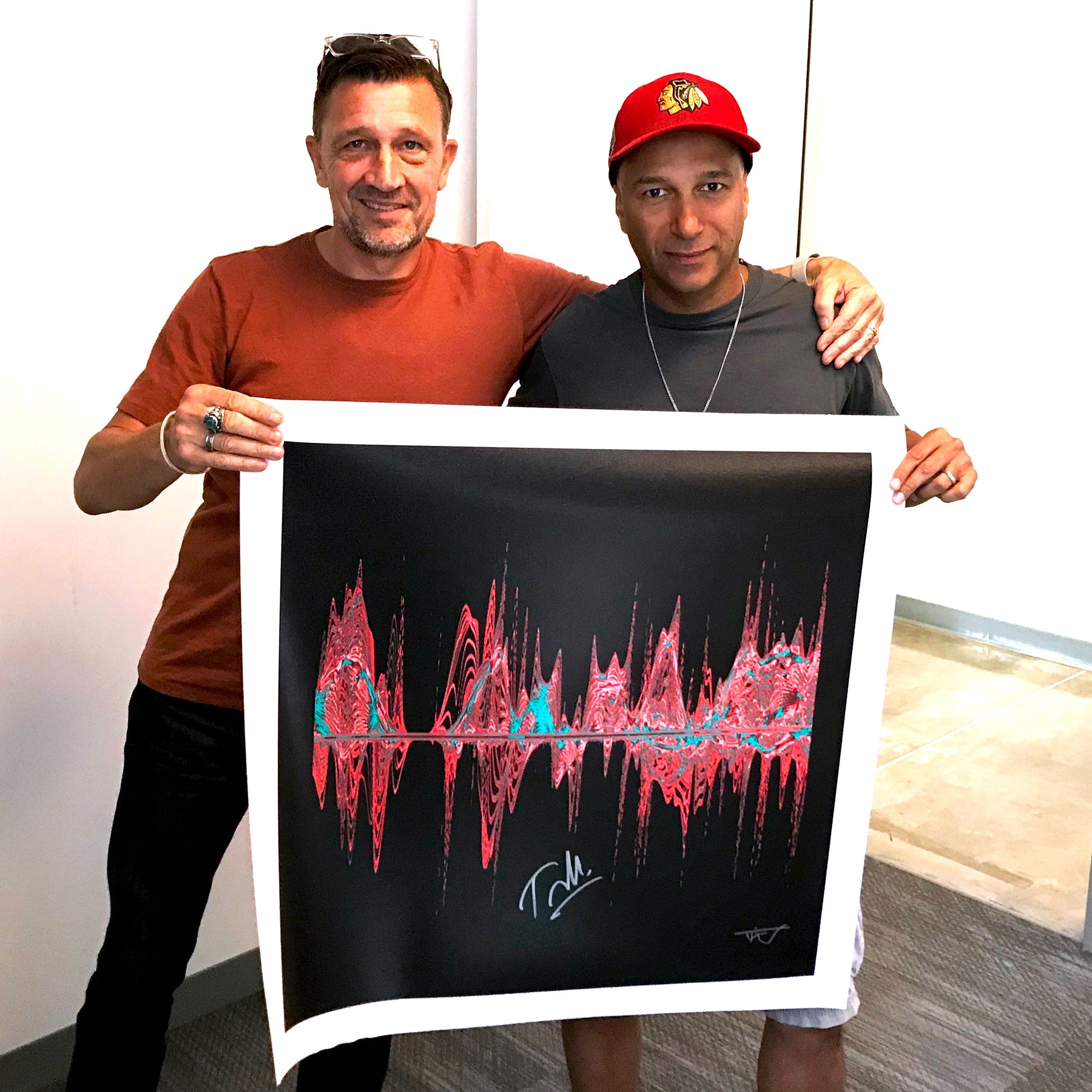 Each signed print measures 24″ x 24″ and is hand signed by the musician. They are part of a larger run of prints, typically with 50-100 copies signed in total. Our unsigned prints, which come in a standard and a mini size, feature the same design as the signed print, but do not have the musician's autograph. They are still limited edition and are signed by Soundwaves Art creator, Tim Wakefield.