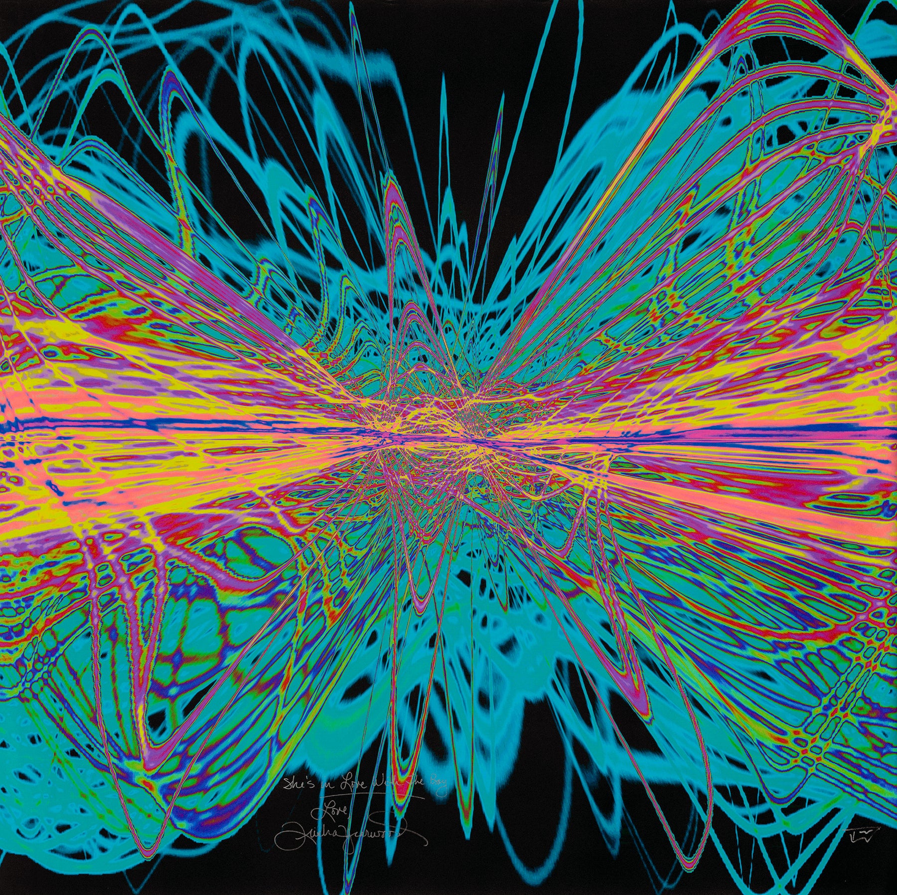 Our Originals measure 38″ x 38″ and often feature a lyric or the title of the song written by the artist in addition to their signature. These are much more limited edition – there is only one Original created per design. Originals sometimes come in alternate color palettes or wave designs to the prints.