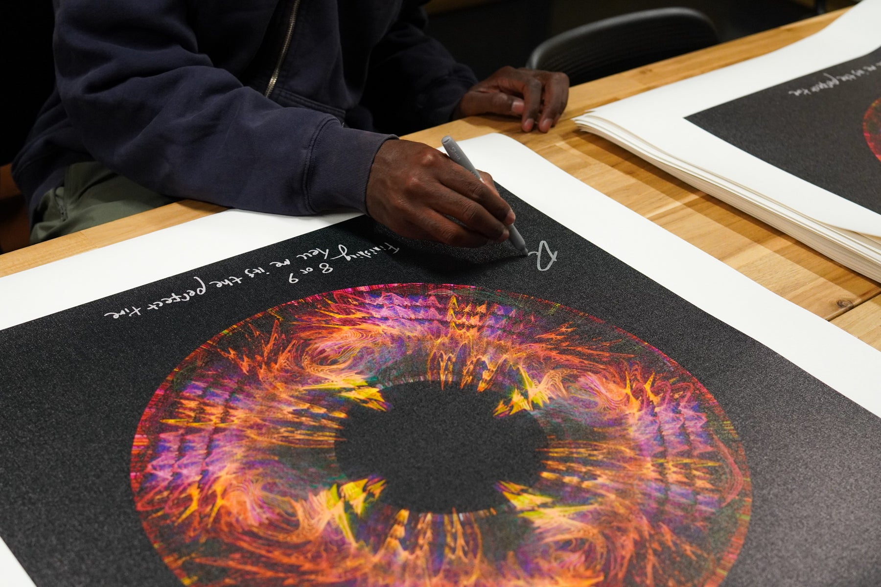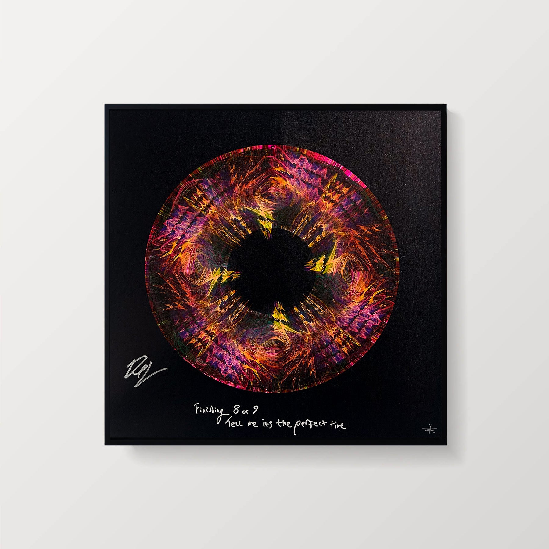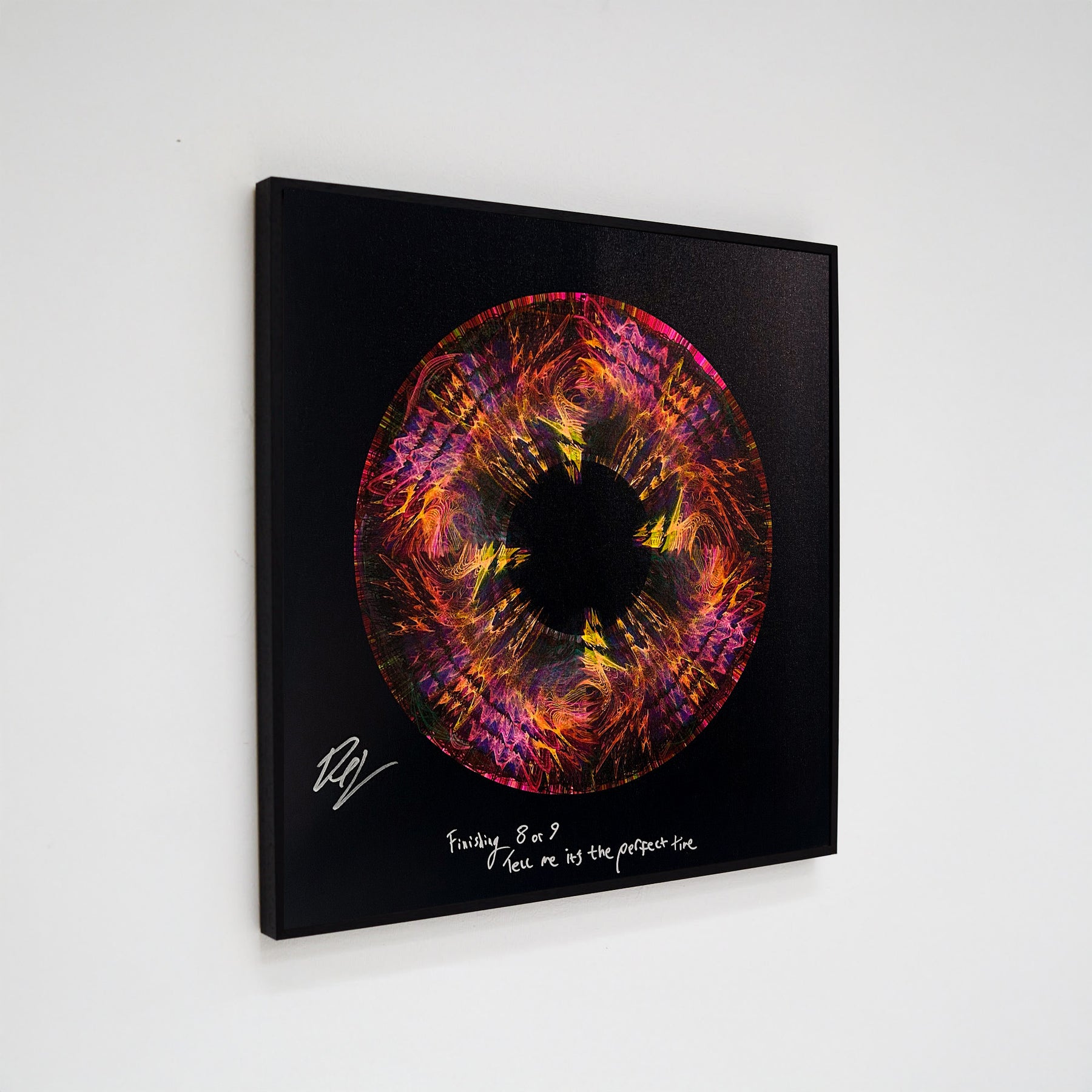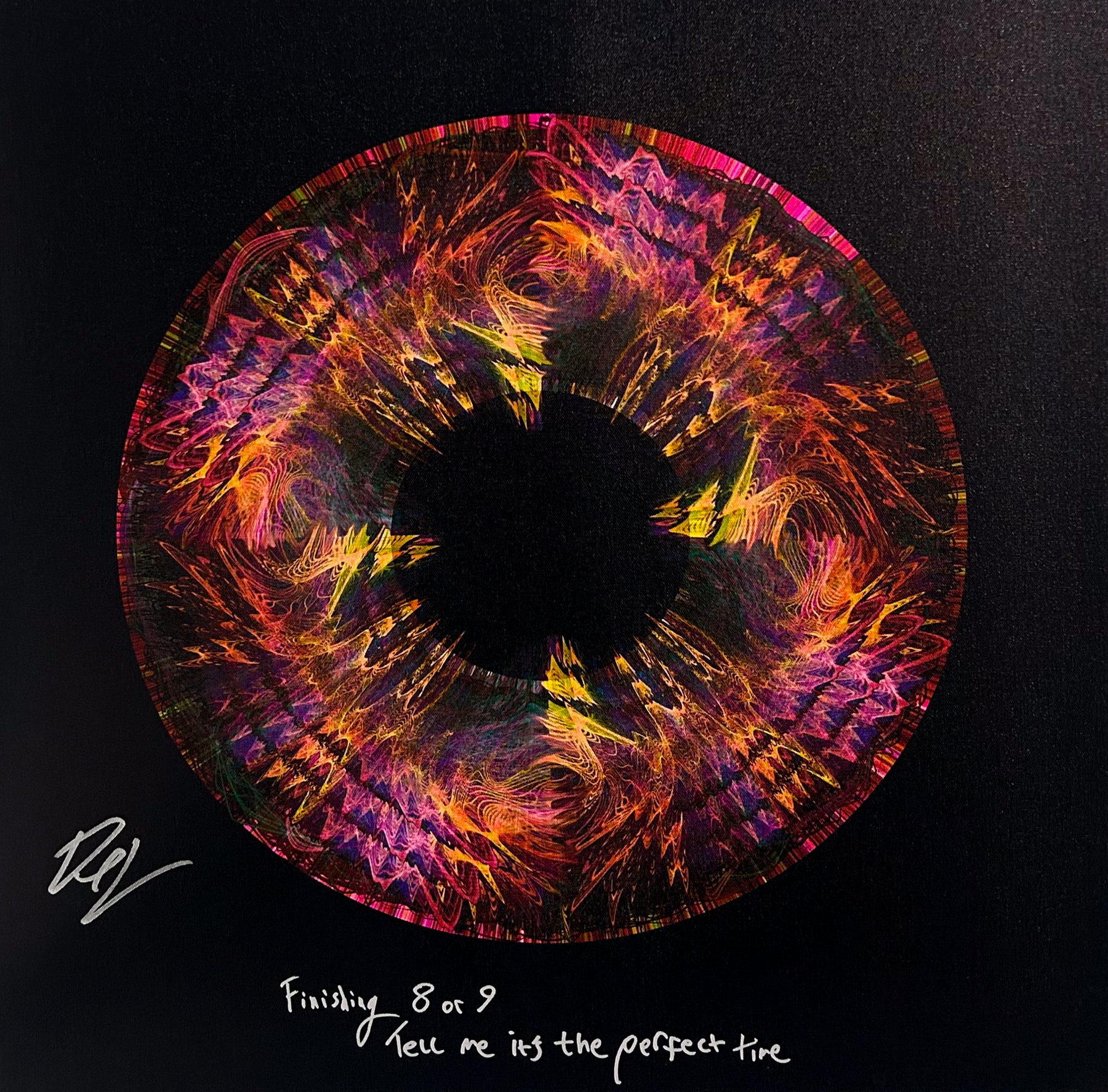 Our Originals measure 38″ x 38″ and often feature a lyric or the title of the song written by the artist in addition to their signature. These are much more limited edition – there is only one Original created per design. Originals sometimes come in alternate color palettes or wave designs to the prints.