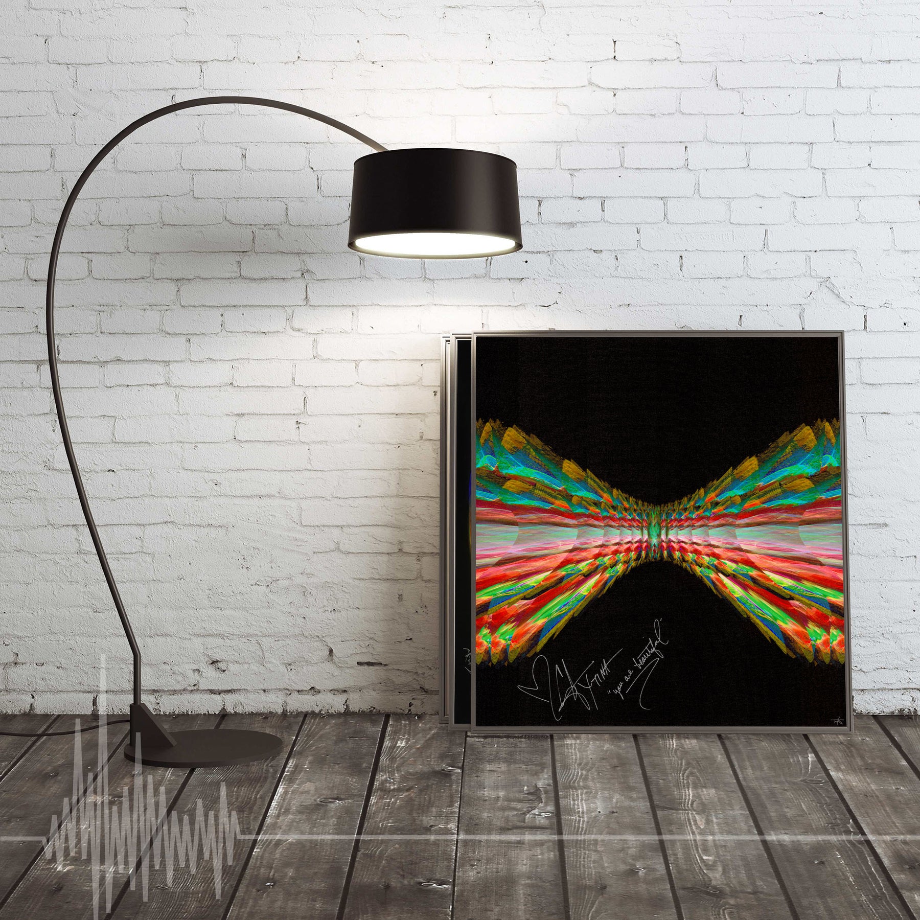 Our Originals measure 38″ x 38″ and often feature a lyric or the title of the song written by the artist in addition to their signature. These are much more limited edition – there is only one Original created per design. Originals sometimes come in alternate color palettes or wave designs to the prints.