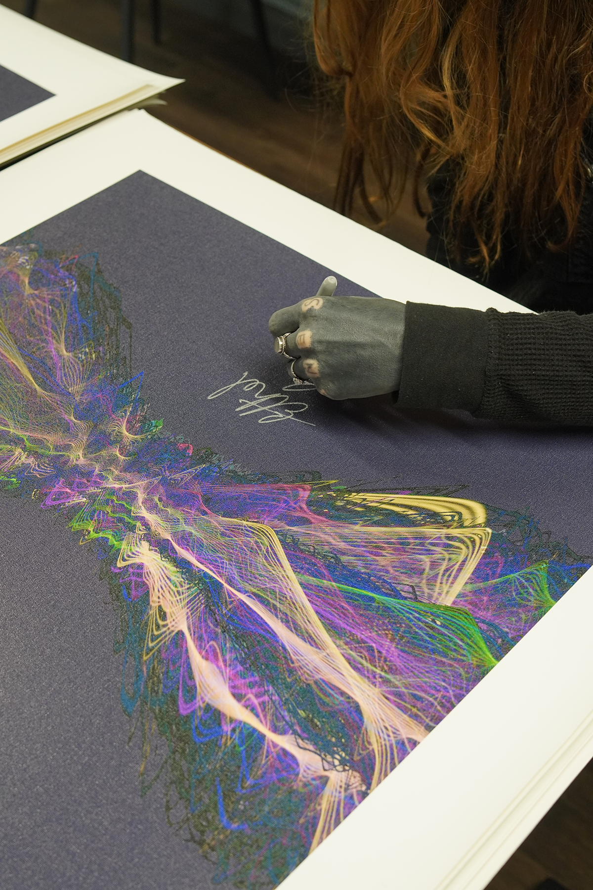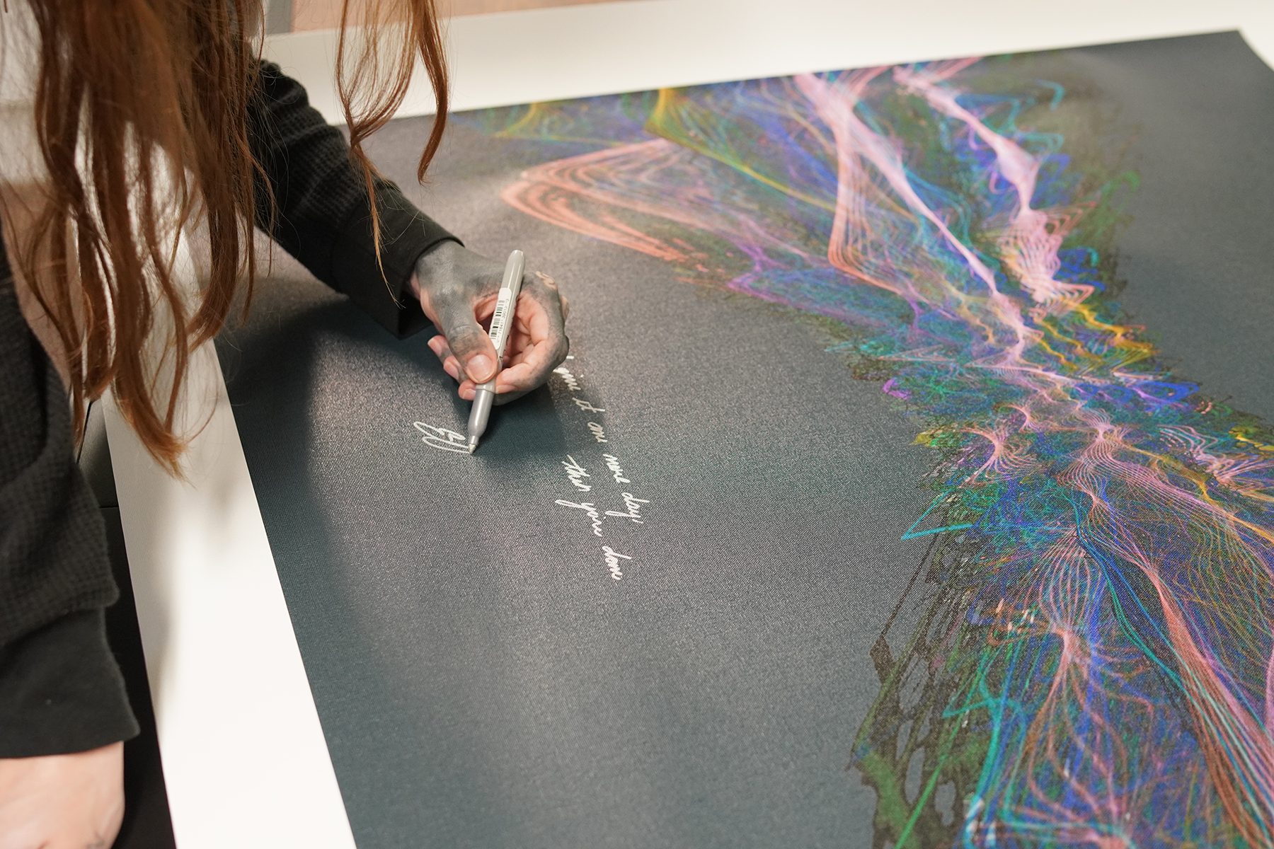 Our Originals measure 38″ x 38″ and often feature a lyric or the title of the song written by the artist in addition to their signature. These are much more limited edition – there is only one Original created per design. Originals sometimes come in alternate color palettes or wave designs to the prints.