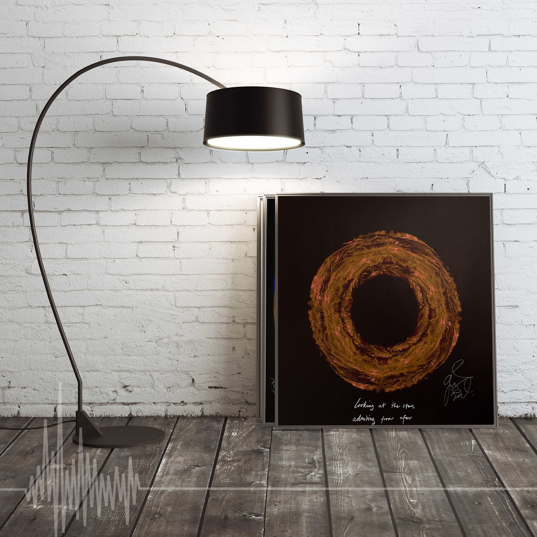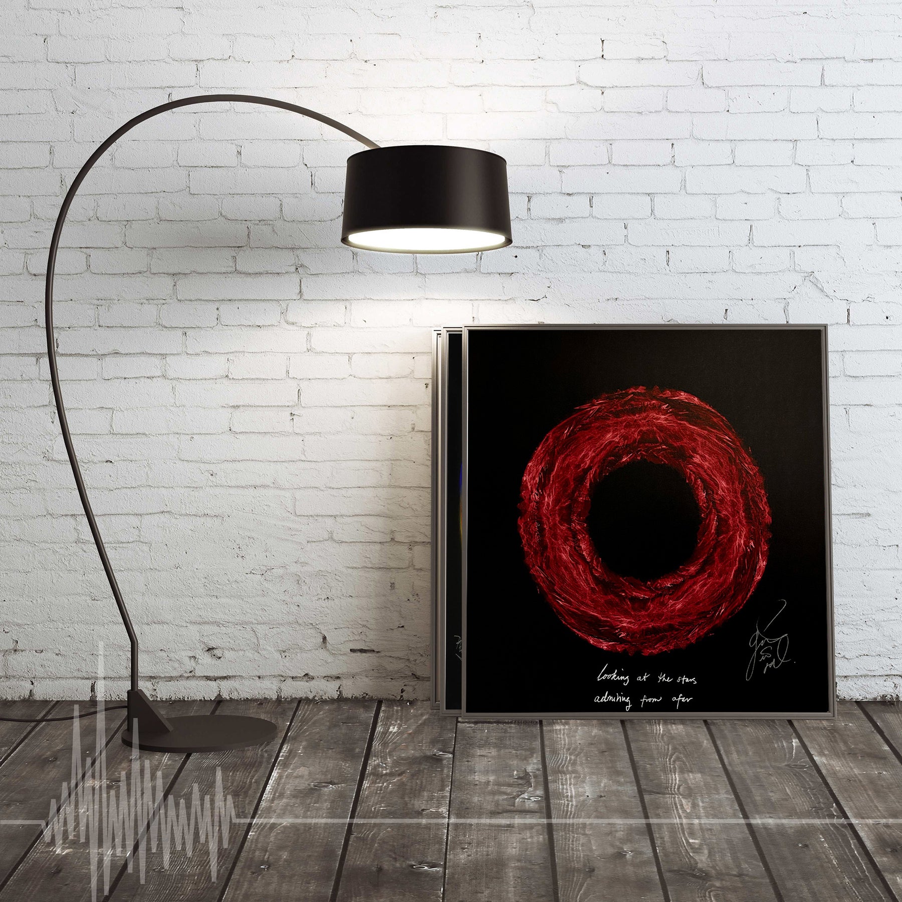 Our Originals measure 38″ x 38″ and often feature a lyric or the title of the song written by the artist in addition to their signature. These are much more limited edition – there is only one Original created per design. Originals sometimes come in alternate color palettes or wave designs to the prints.