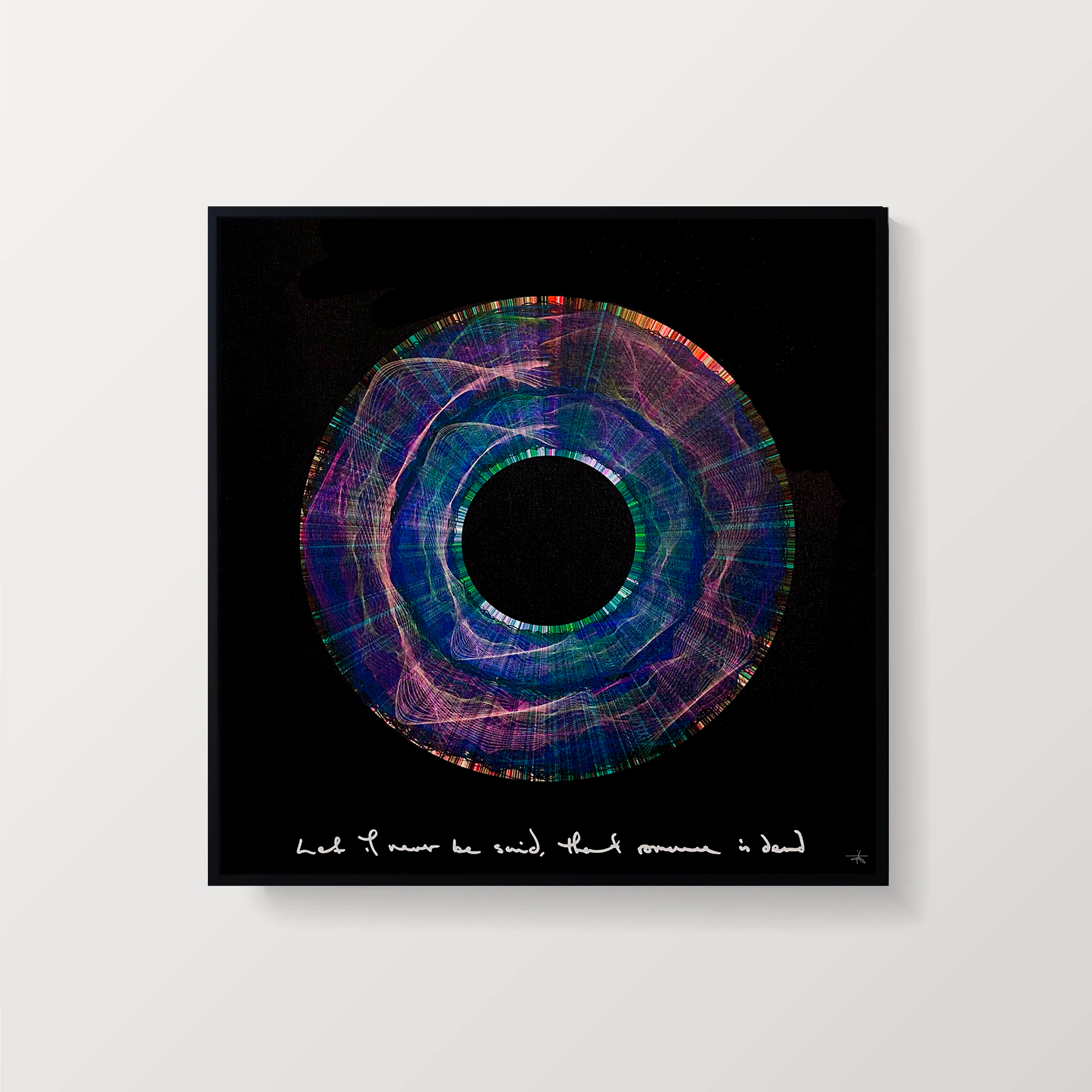 Our Originals measure 38″ x 38″ and often feature a lyric or the title of the song written by the artist in addition to their signature. These are much more limited edition – there is only one Original created per design. Originals sometimes come in alternate color palettes or wave designs to the prints.