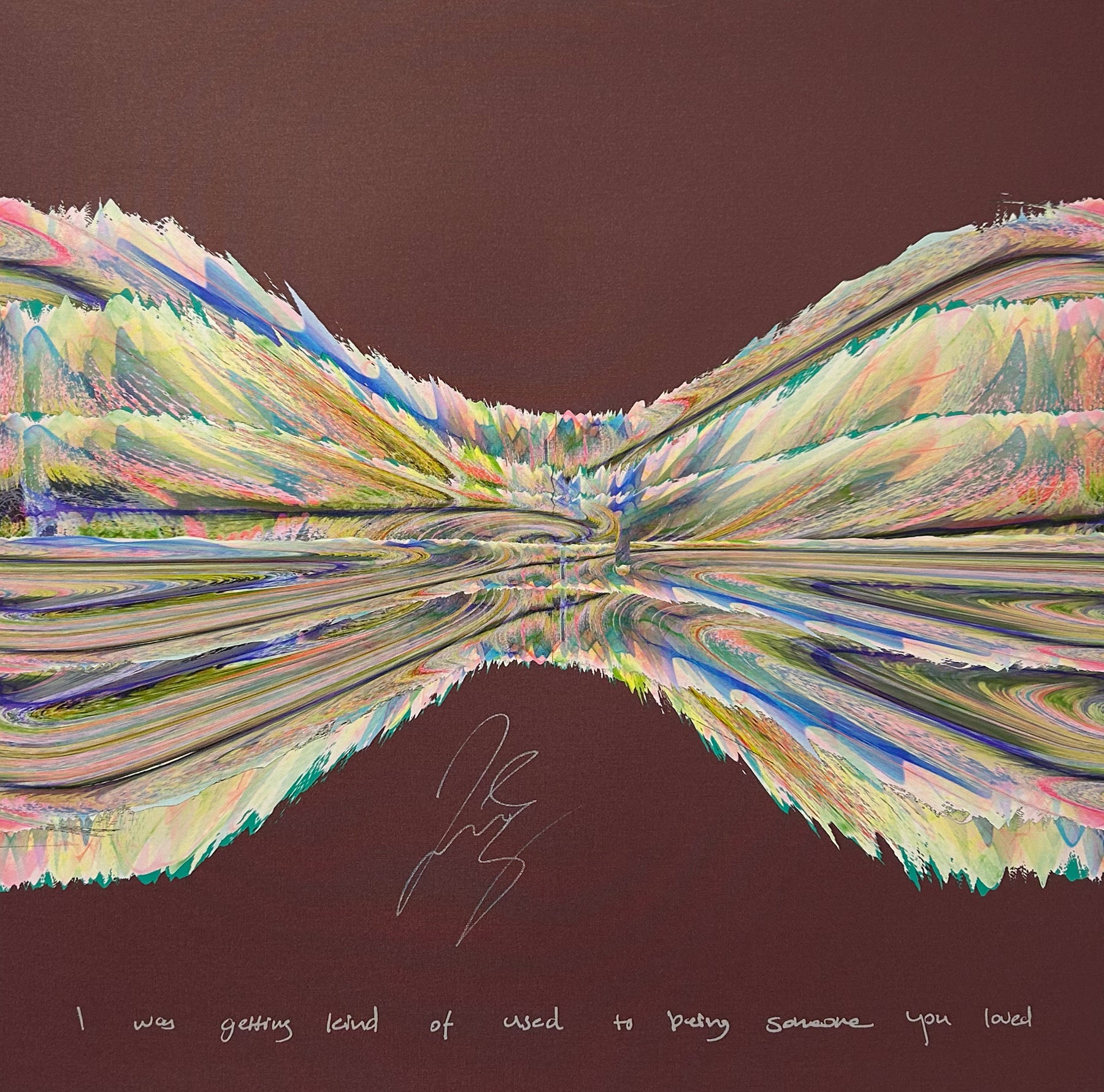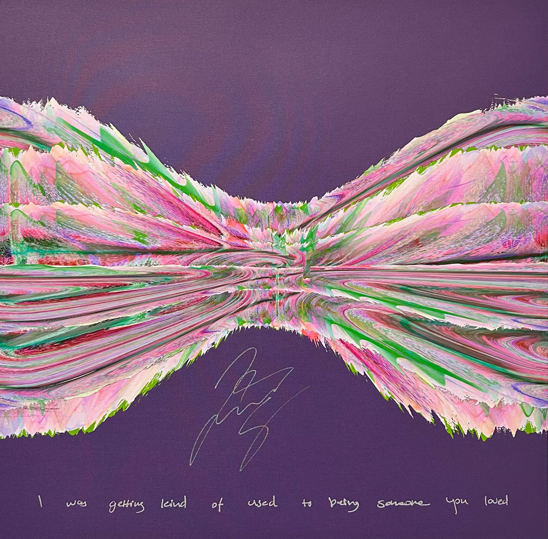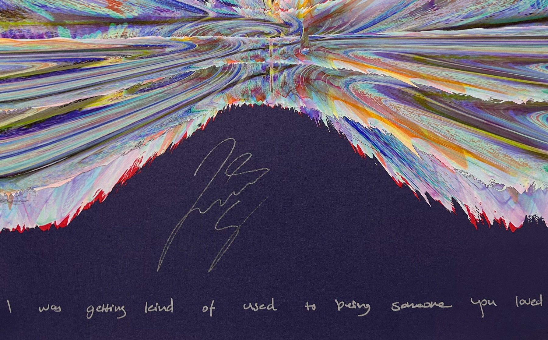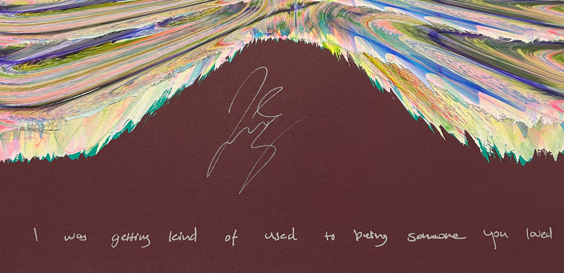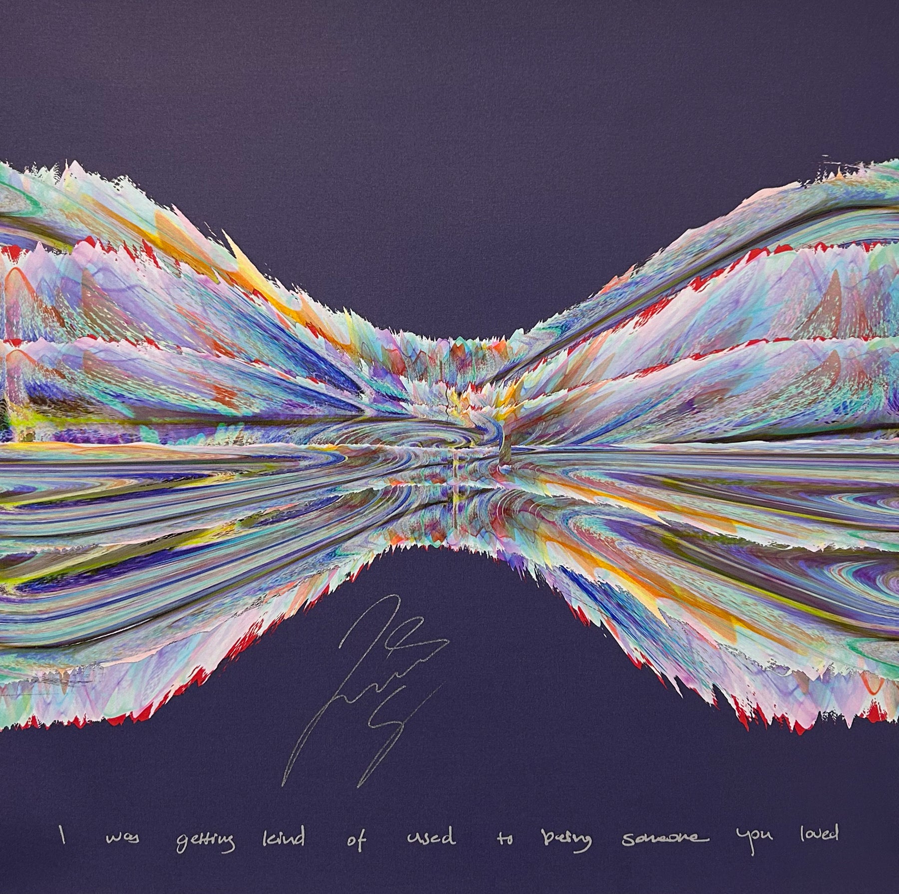 Our Originals measure 38″ x 38″ and often feature a lyric or the title of the song written by the artist in addition to their signature. These are much more limited edition – there is only one Original created per design. Originals sometimes come in alternate color palettes or wave designs to the prints.