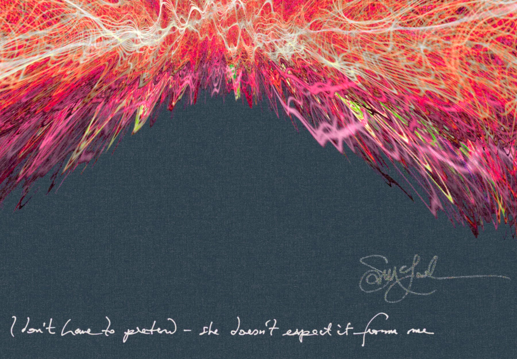 Each artwork features handwritten lyrics by Sarah that were digitally added: "I don't have to pretend she doesn't expect it from me".