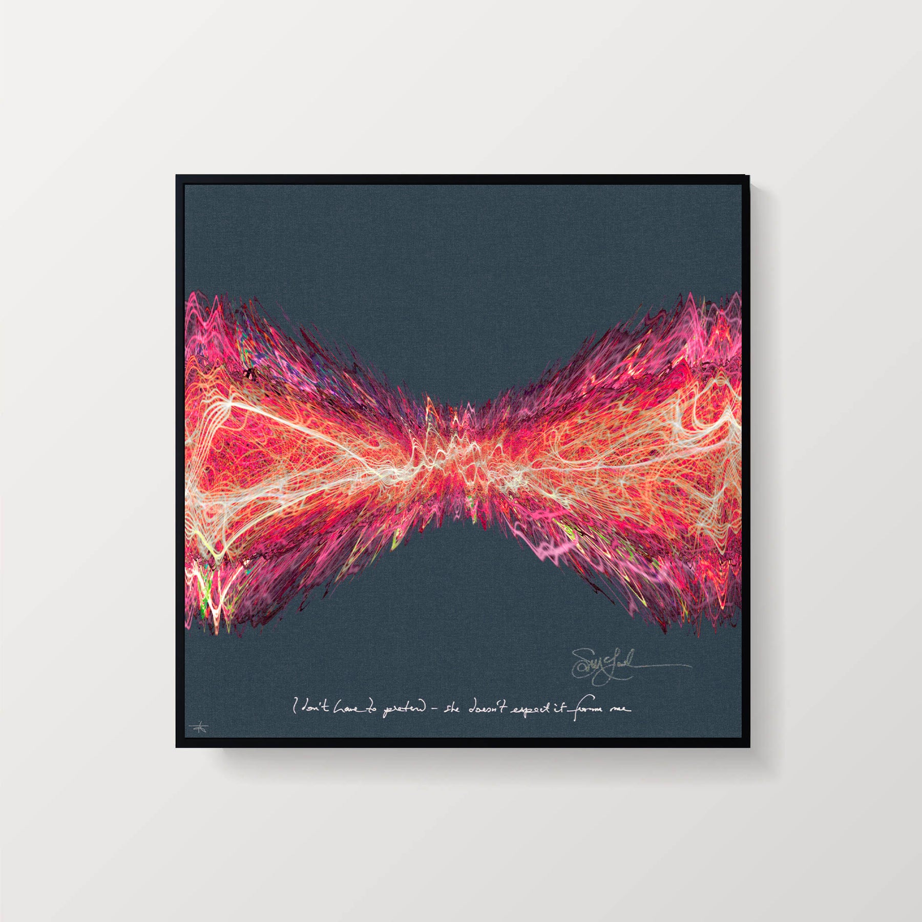 Our Originals measure 38″ x 38″ and often feature a lyric or the title of the song written by the artist in addition to their signature. These are much more limited edition – there is only one Original created per design. Originals sometimes come in alternate color palettes or wave designs to the prints.