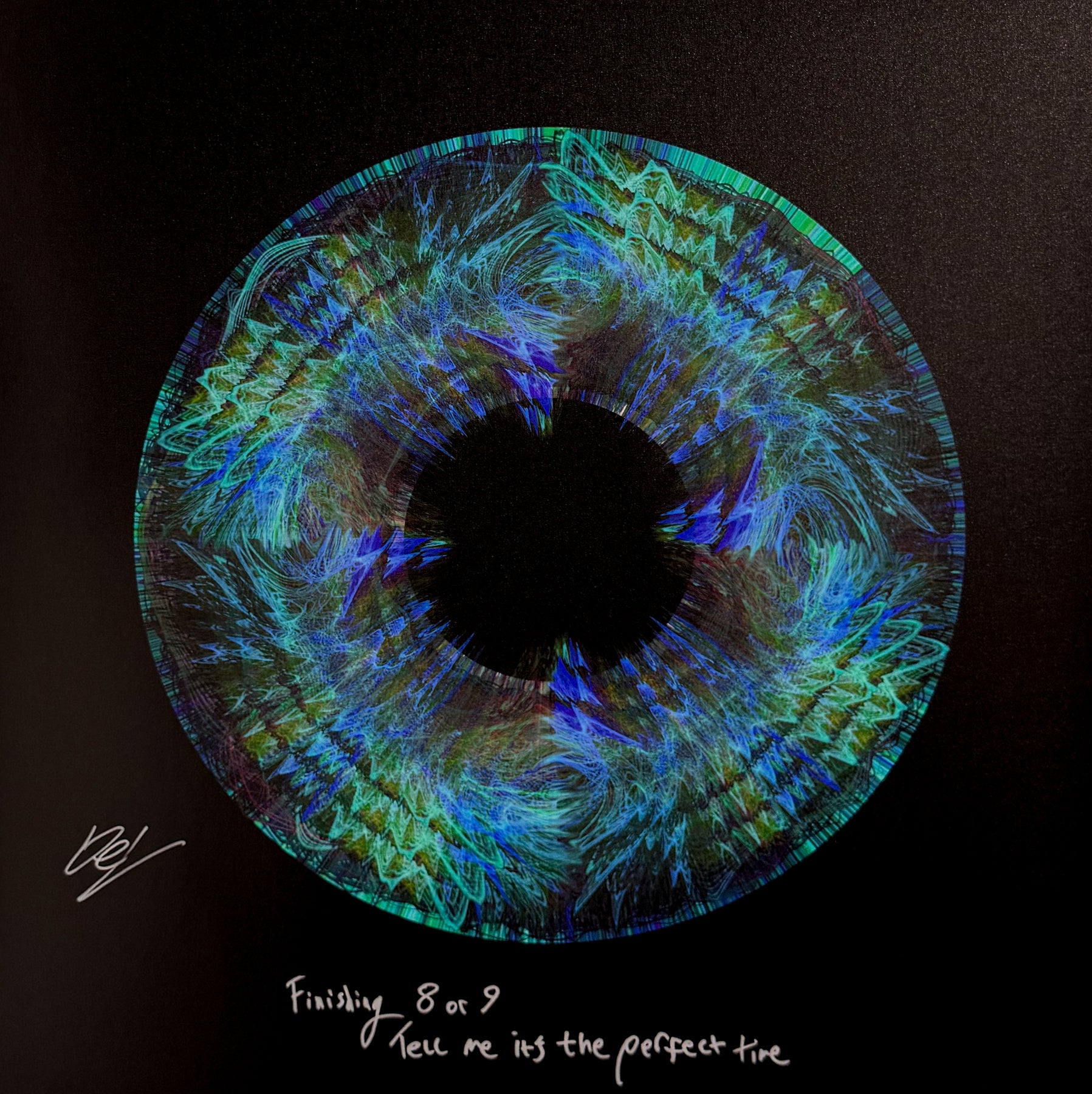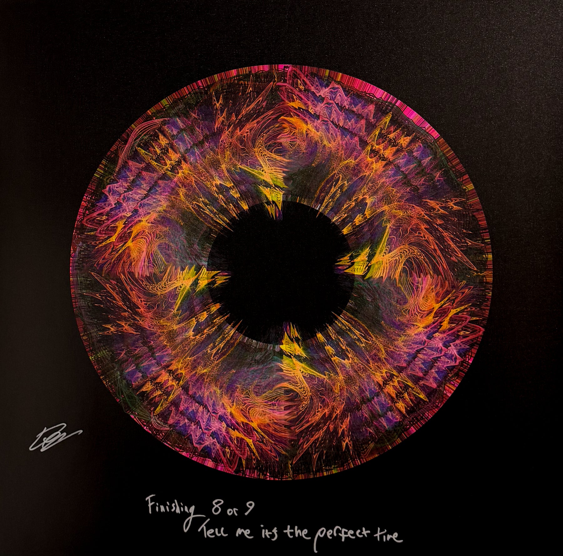 Our Originals measure 38″ x 38″ and often feature a lyric or the title of the song written by the artist in addition to their signature. These are much more limited edition – there is only one Original created per design. Originals sometimes come in alternate color palettes or wave designs to the prints.
