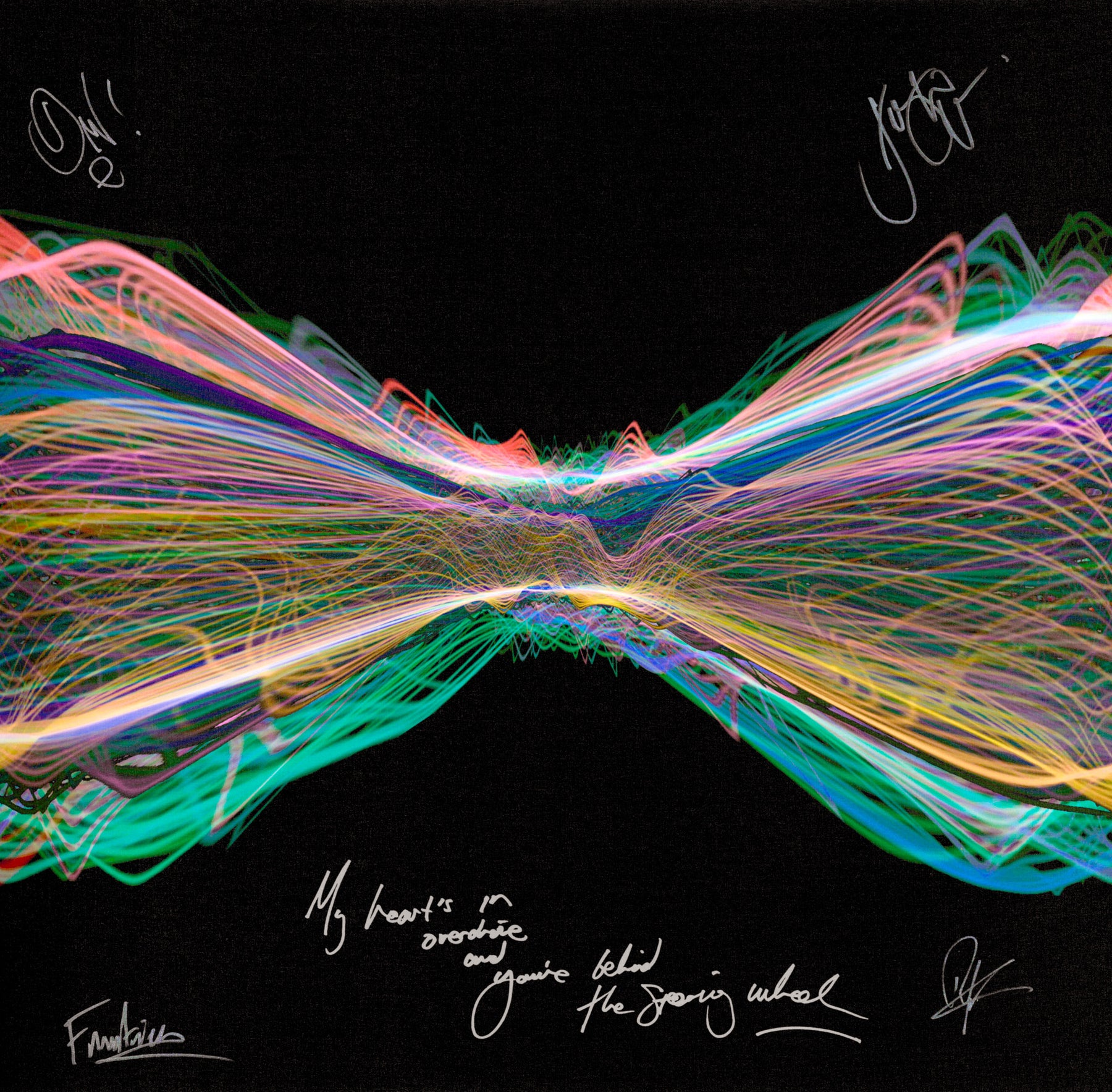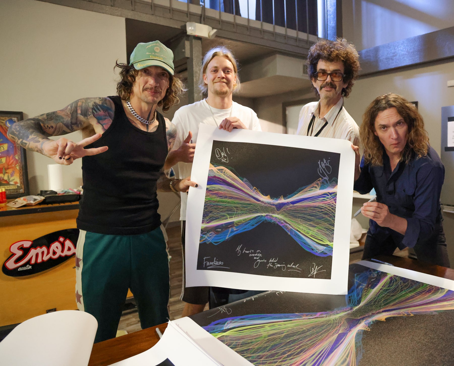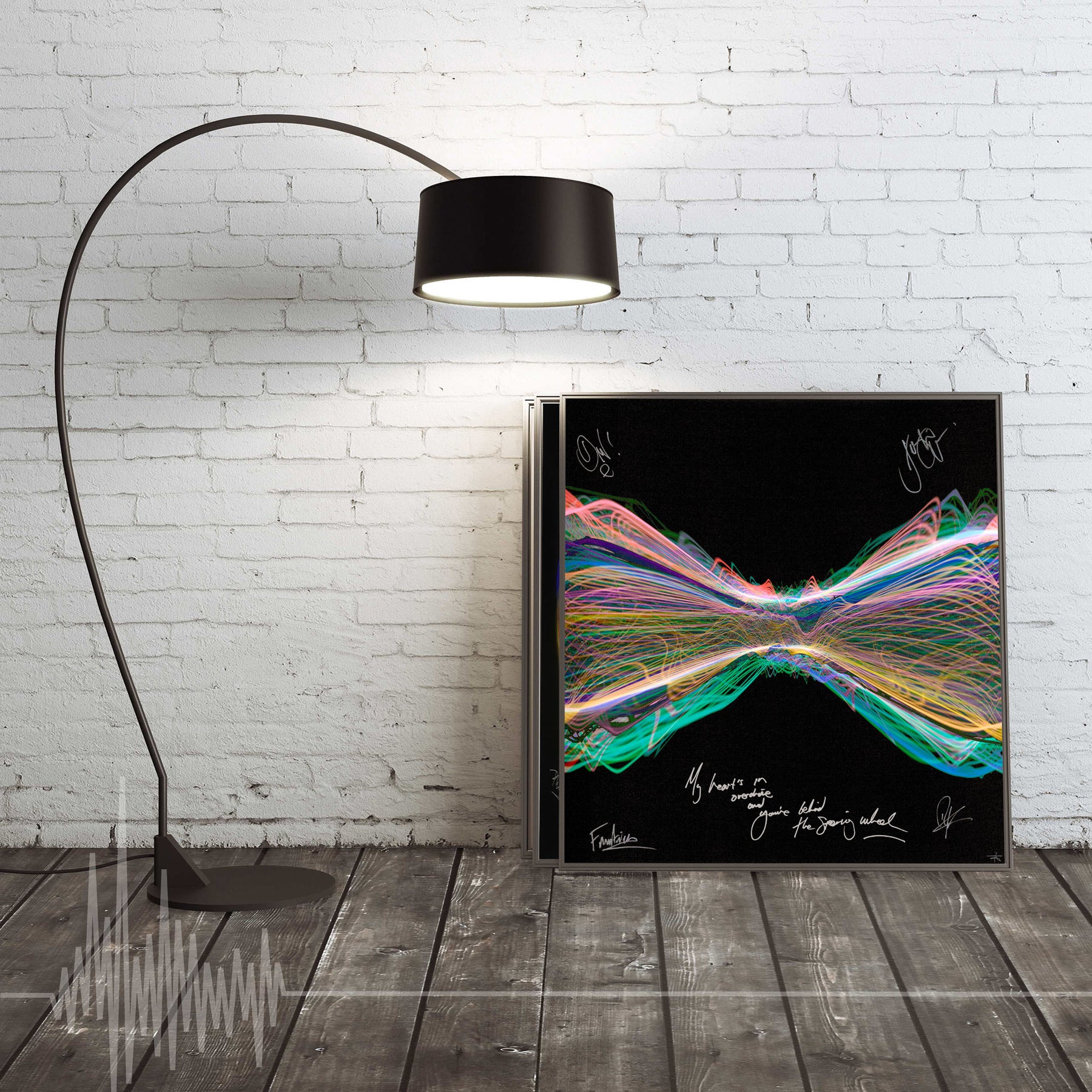 Original Soundwaves Artwork created from the sound waves of The Darkness’ "I Believe in a Thing Called Love." Justin Hawkins, Dan Hawkins, Frankie Poullain and Rufus Tiger Taylor hand-signed these Original artworks at Emo's in Austin, TX on November 8, 2025.
