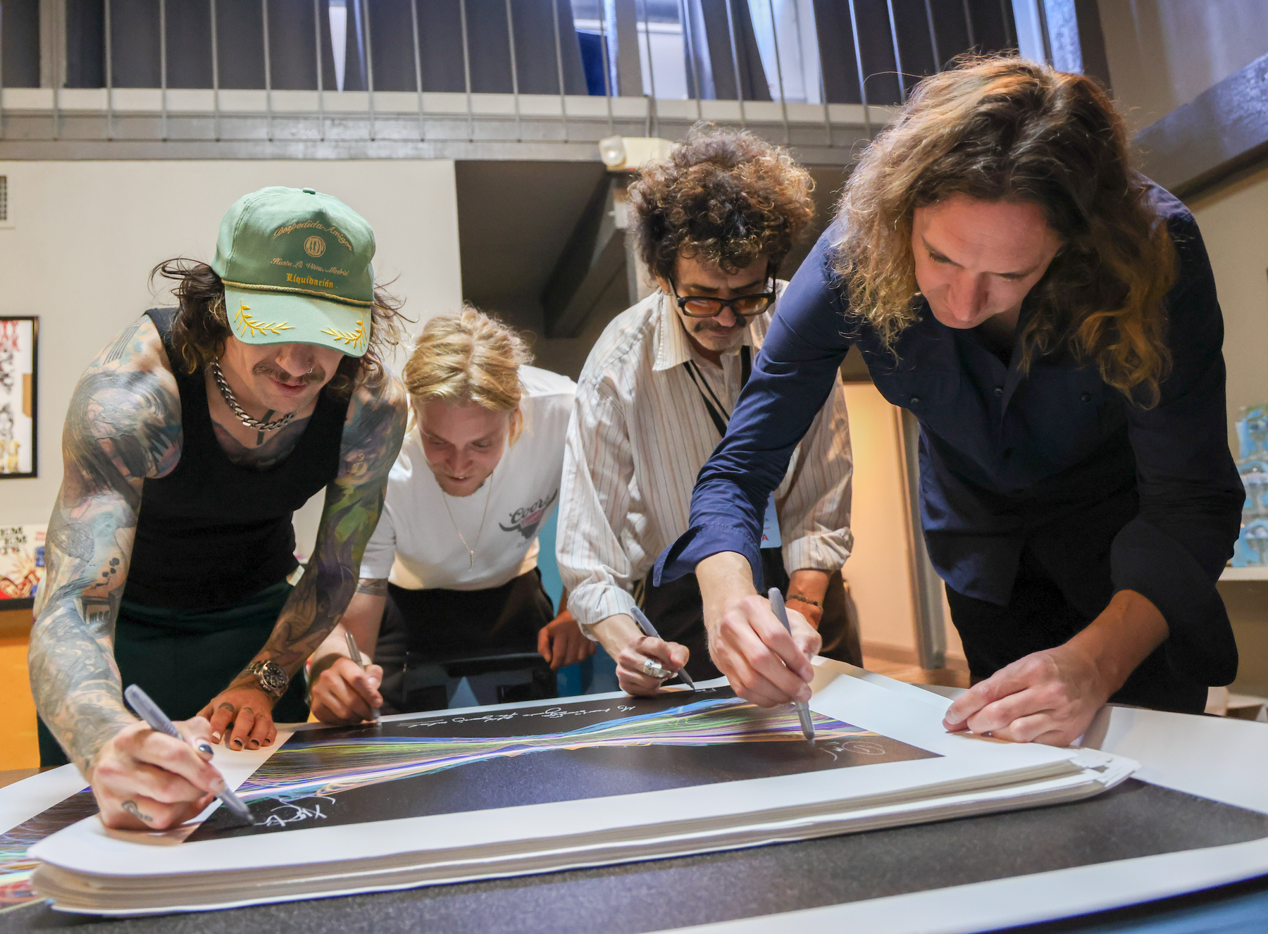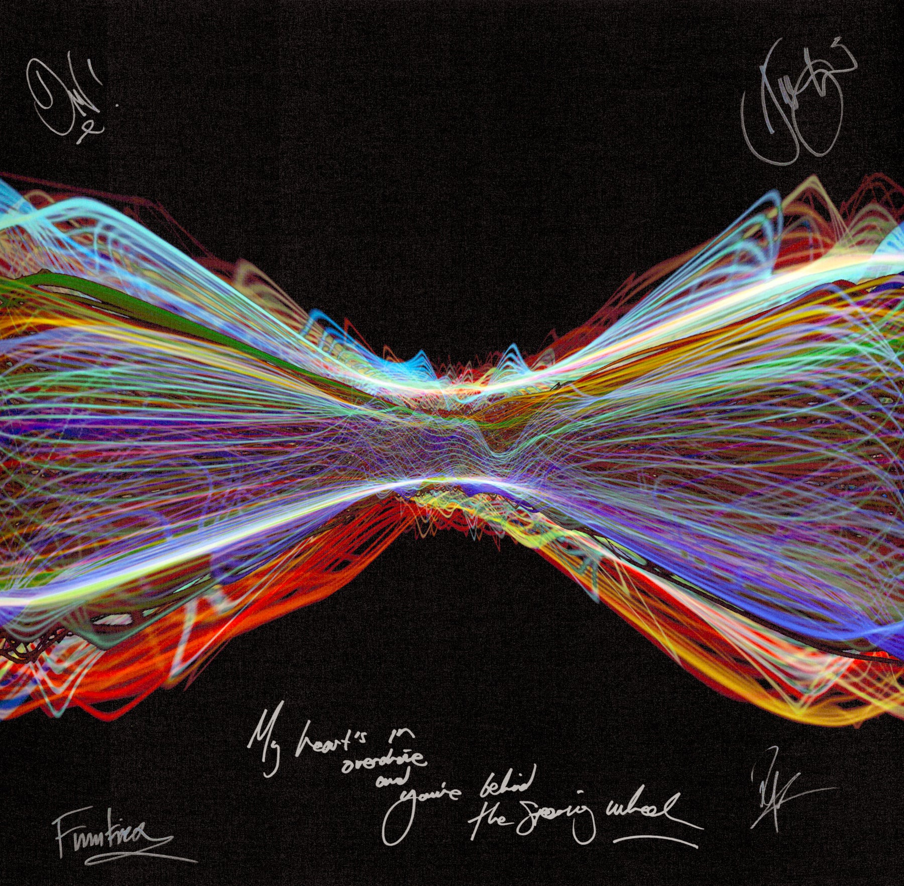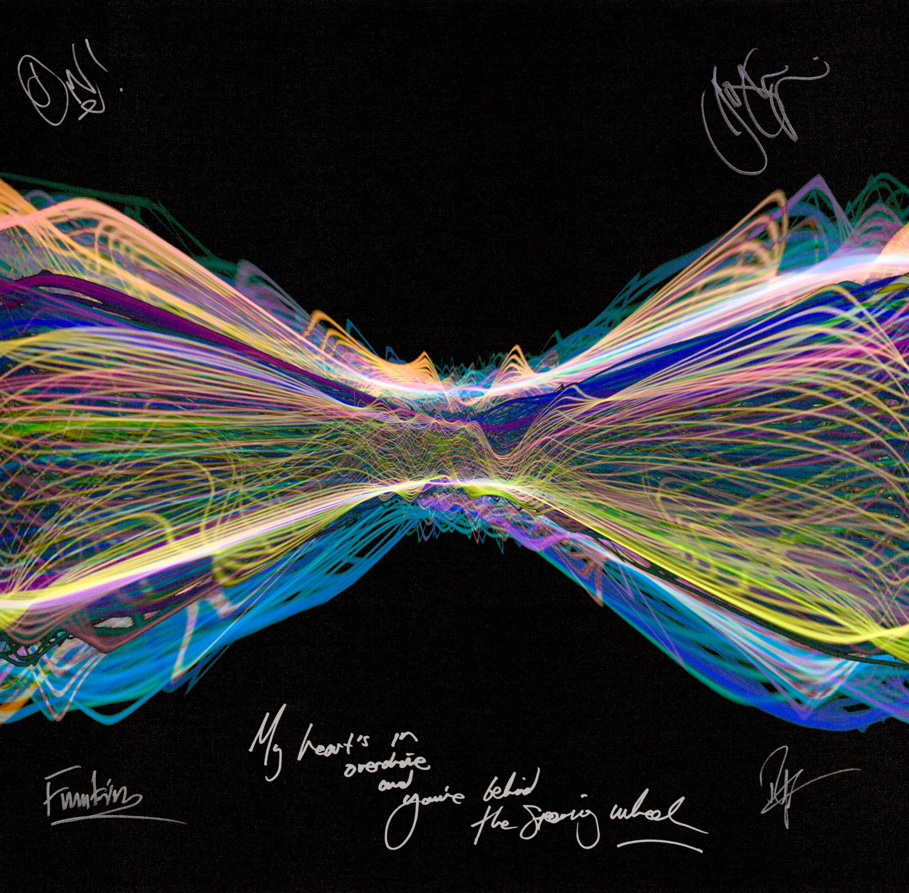 Original Soundwaves Artwork created from the sound waves of The Darkness’ "I Believe in a Thing Called Love." Justin Hawkins, Dan Hawkins, Frankie Poullain and Rufus Tiger Taylor hand-signed these Original artworks at Emo's in Austin, TX on November 8, 2025.