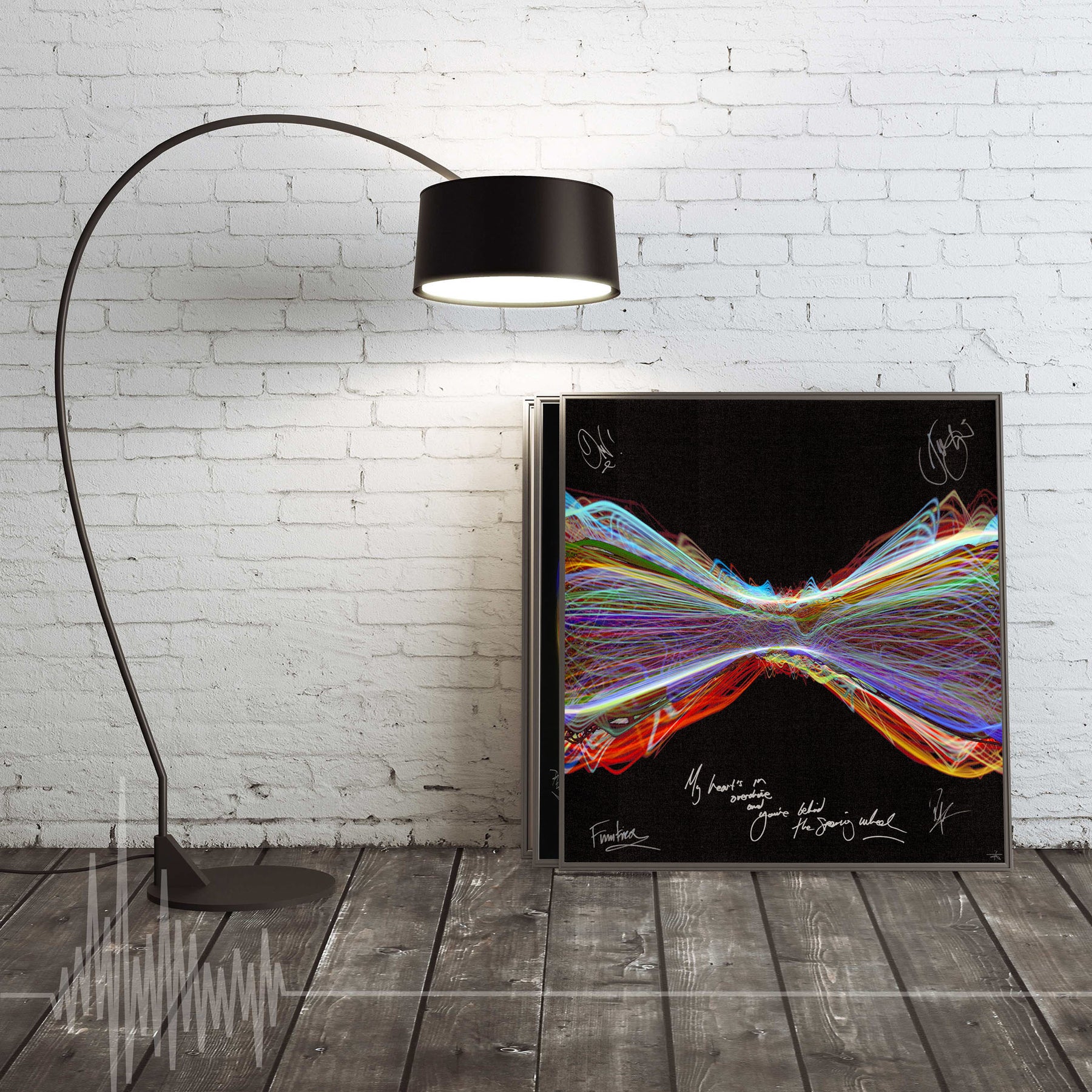 Each signed print measures 24″ x 24″ and is hand signed by the musician. They are part of a larger run of prints, typically with 50-100 copies signed in total. Our unsigned prints, which come in a standard and a mini size, feature the same design as the signed print, but do not have the musician's autograph. They are still limited edition and are signed by Soundwaves Art creator, Tim Wakefield.