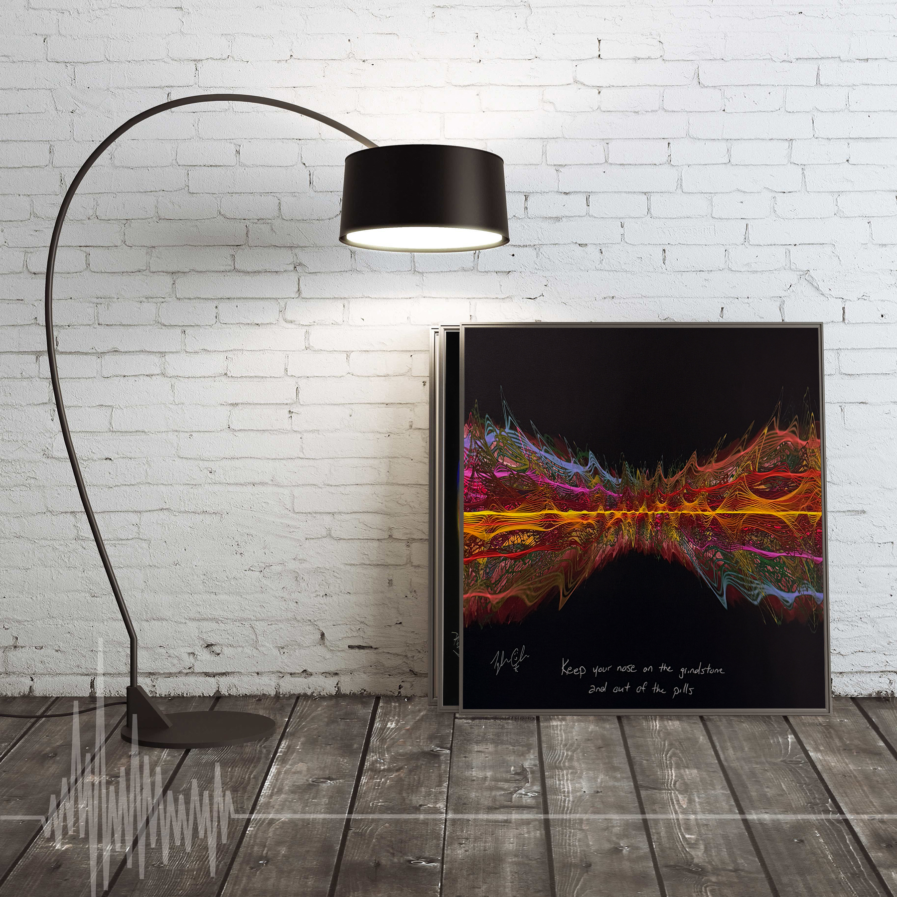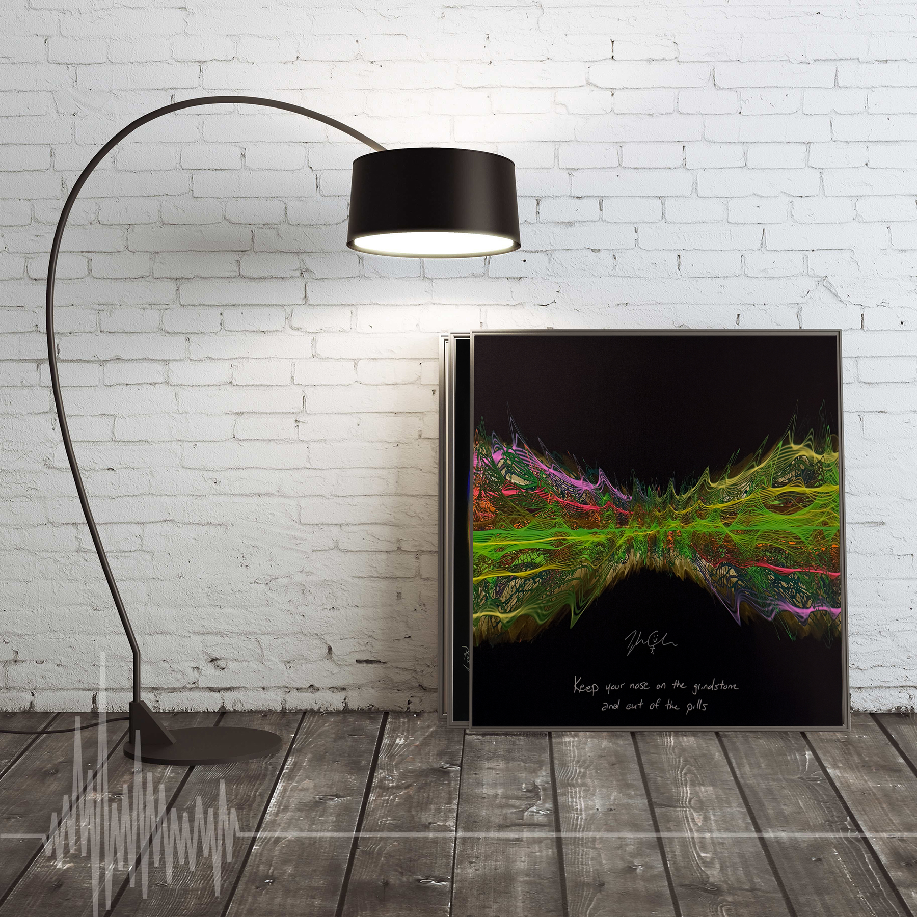 Each signed print measures 24″ x 24″ and is hand signed by the musician. They are part of a larger run of prints, typically with 50-100 copies signed in total. Our unsigned prints, which come in a standard and a mini size, feature the same design as the signed print, but do not have the musician's autograph. They are still limited edition and are signed by Soundwaves Art creator, Tim Wakefield.