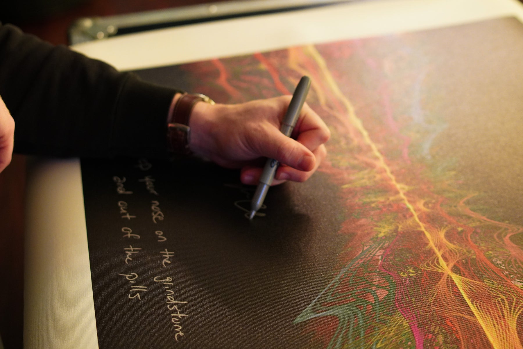 Our Originals measure 38″ x 38″ and often feature a lyric or the title of the song written by the artist in addition to their signature. These are much more limited edition – there is only one Original created per design. Originals sometimes come in alternate color palettes or wave designs to the prints.