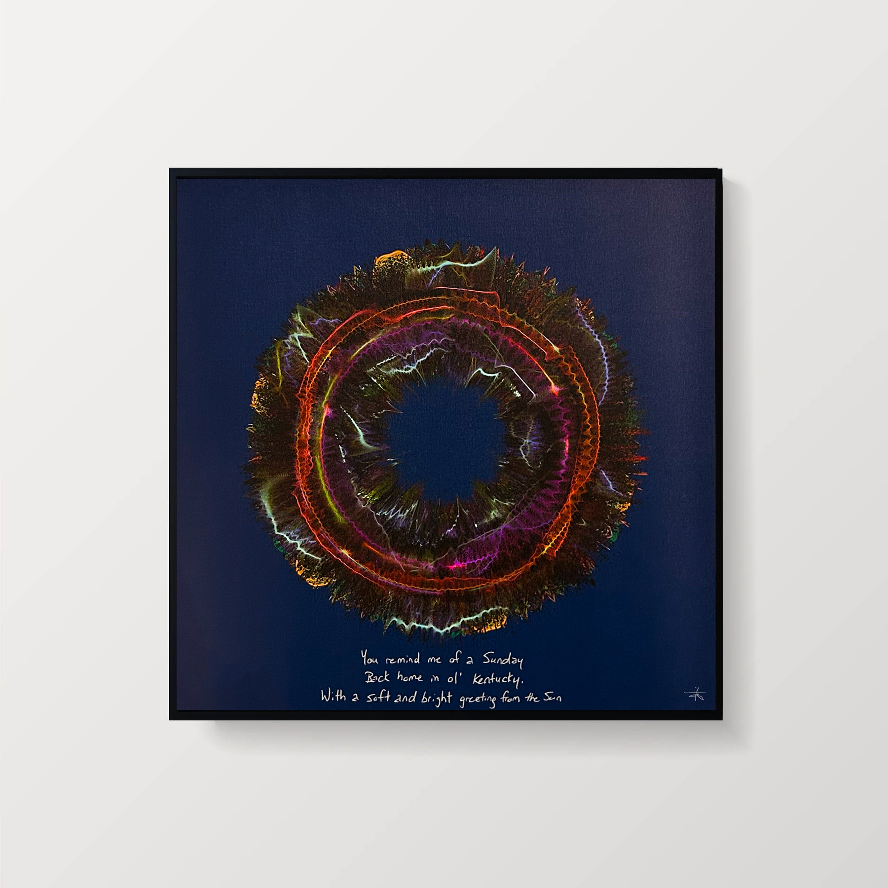 Our Originals measure 38″ x 38″ and often feature a lyric or the title of the song written by the artist in addition to their signature. These are much more limited edition – there is only one Original created per design. Originals sometimes come in alternate color palettes or wave designs to the prints.