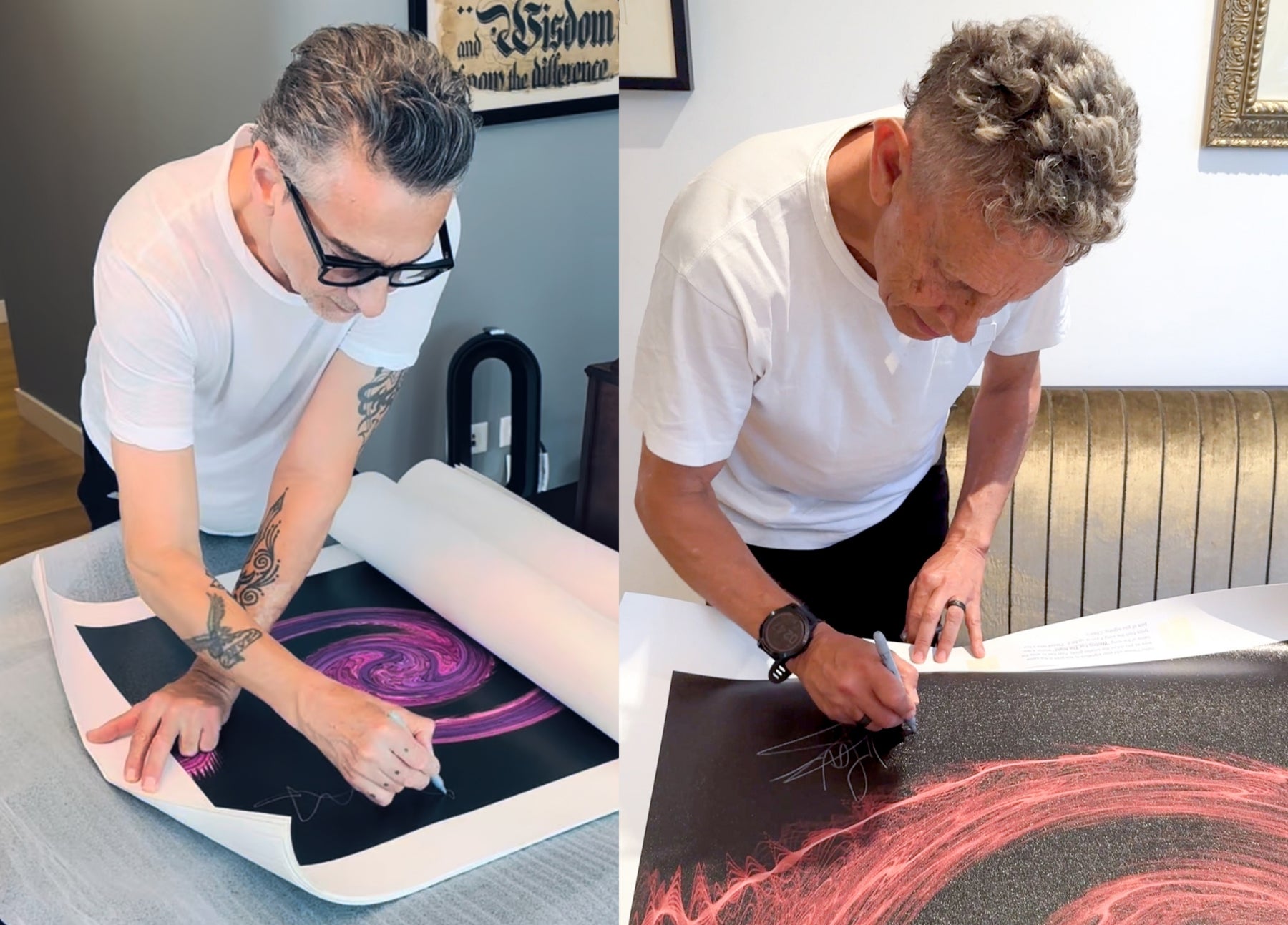 Our Originals measure 38″ x 38″ and often feature a lyric or the title of the song written by the artist in addition to their signature. These are much more limited edition – there is only one Original created per design. Originals sometimes come in alternate color palettes or wave designs to the prints.