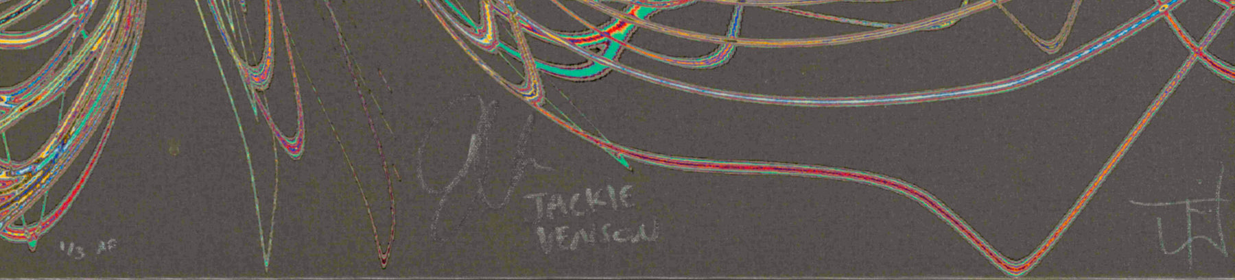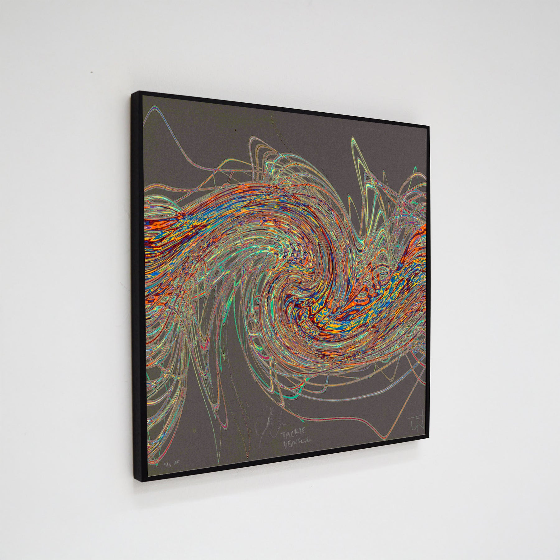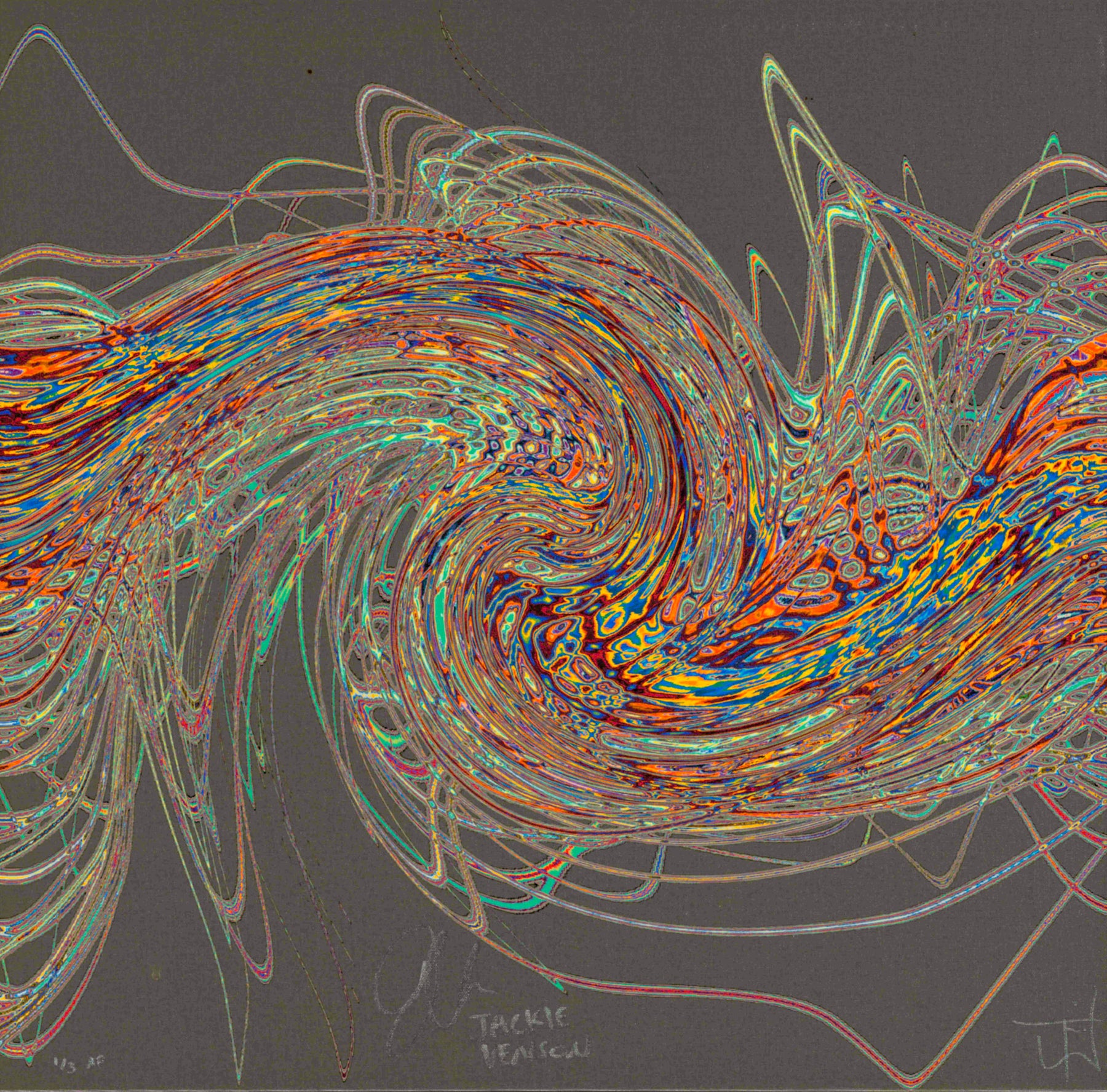 Our Originals measure 38″ x 38″ and often feature a lyric or the title of the song written by the artist in addition to their signature. These are much more limited edition – there is only one Original created per design. Originals sometimes come in alternate color palettes or wave designs to the prints.