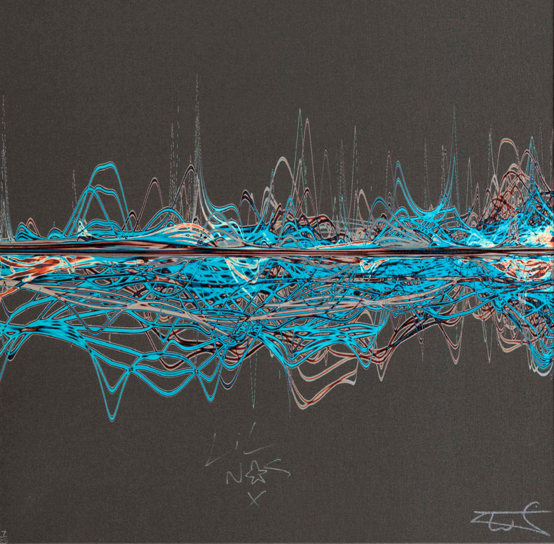 Our Originals measure 38″ x 38″ and often feature a lyric or the title of the song written by the artist in addition to their signature. These are much more limited edition – there is only one Original created per design. Originals sometimes come in alternate color palettes or wave designs to the prints.