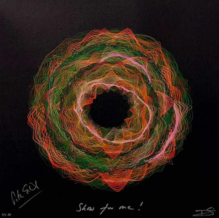 Our Originals measure 38″ x 38″ and often feature a lyric or the title of the song written by the artist in addition to their signature. These are much more limited edition – there is only one Original created per design. Originals sometimes come in alternate color palettes or wave designs to the prints.
