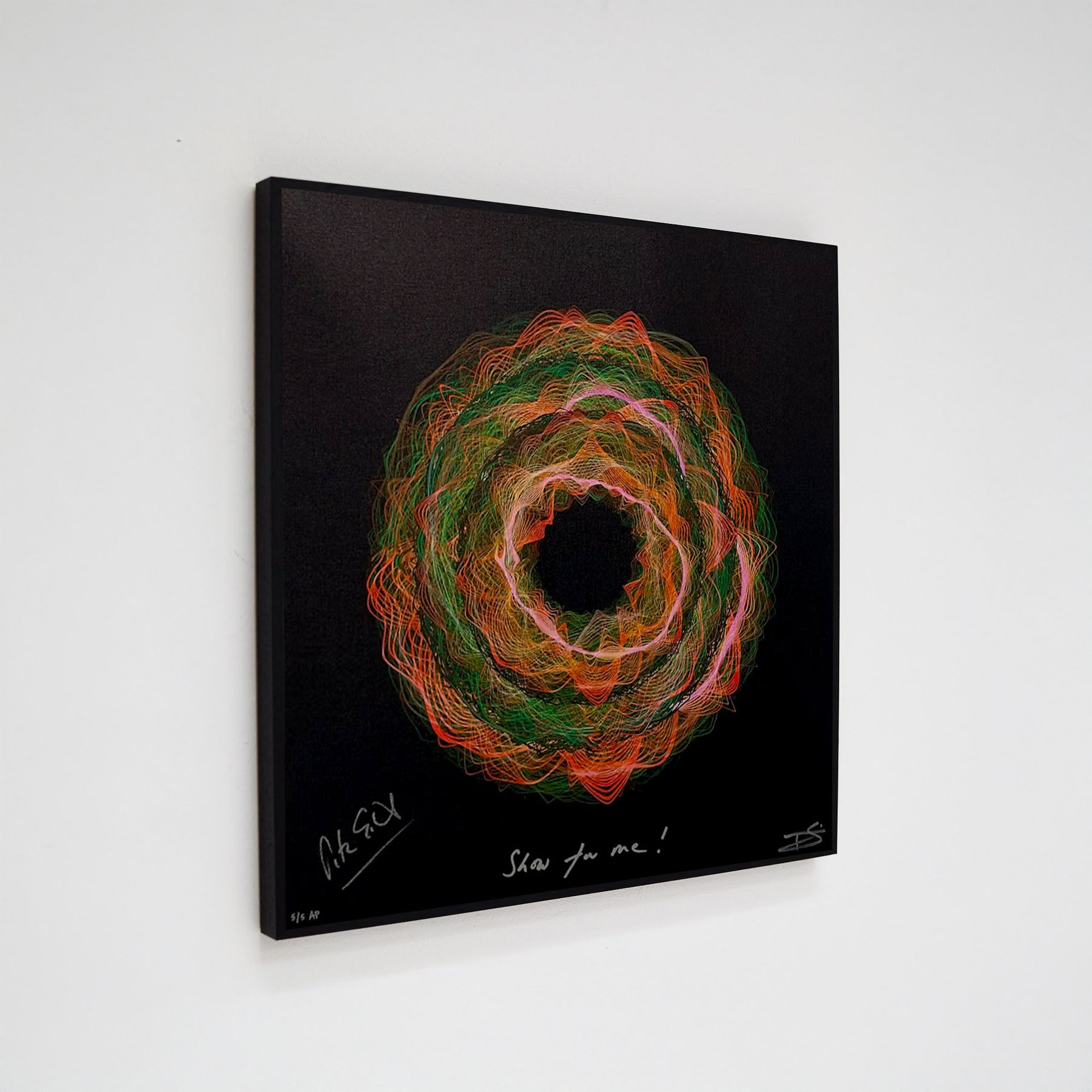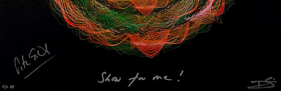Each signed print measures 24″ x 24″ and is hand signed by the musician. They are part of a larger run of prints, typically with 50-100 copies signed in total. Our unsigned prints, which come in a standard and a mini size, feature the same design as the signed print, but do not have the musician's autograph. They are still limited edition and are signed by Soundwaves Art creator, Tim Wakefield.
