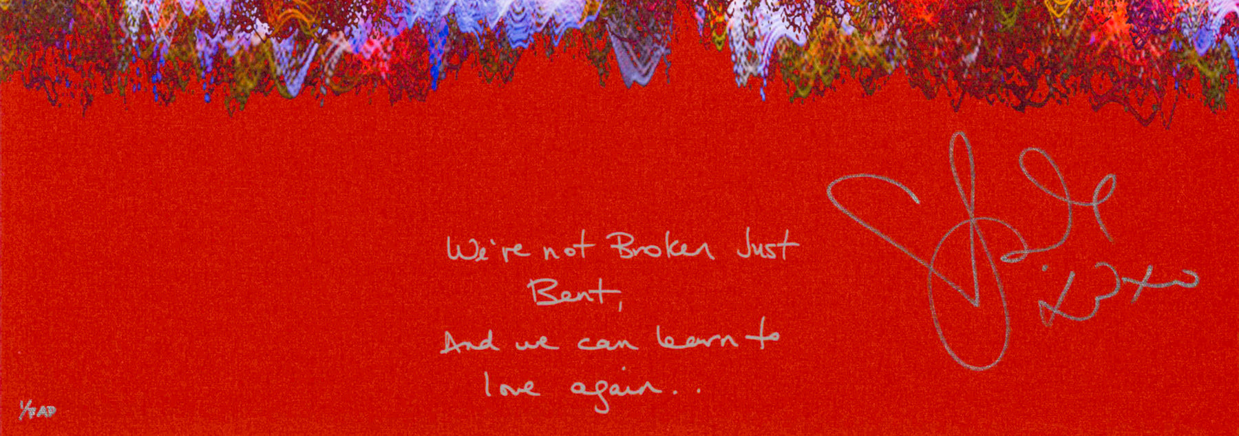 The artwork also features the lyric "We're not broken, just bent. And we can learn to love again" written by P!nk and printed onto the artwork.