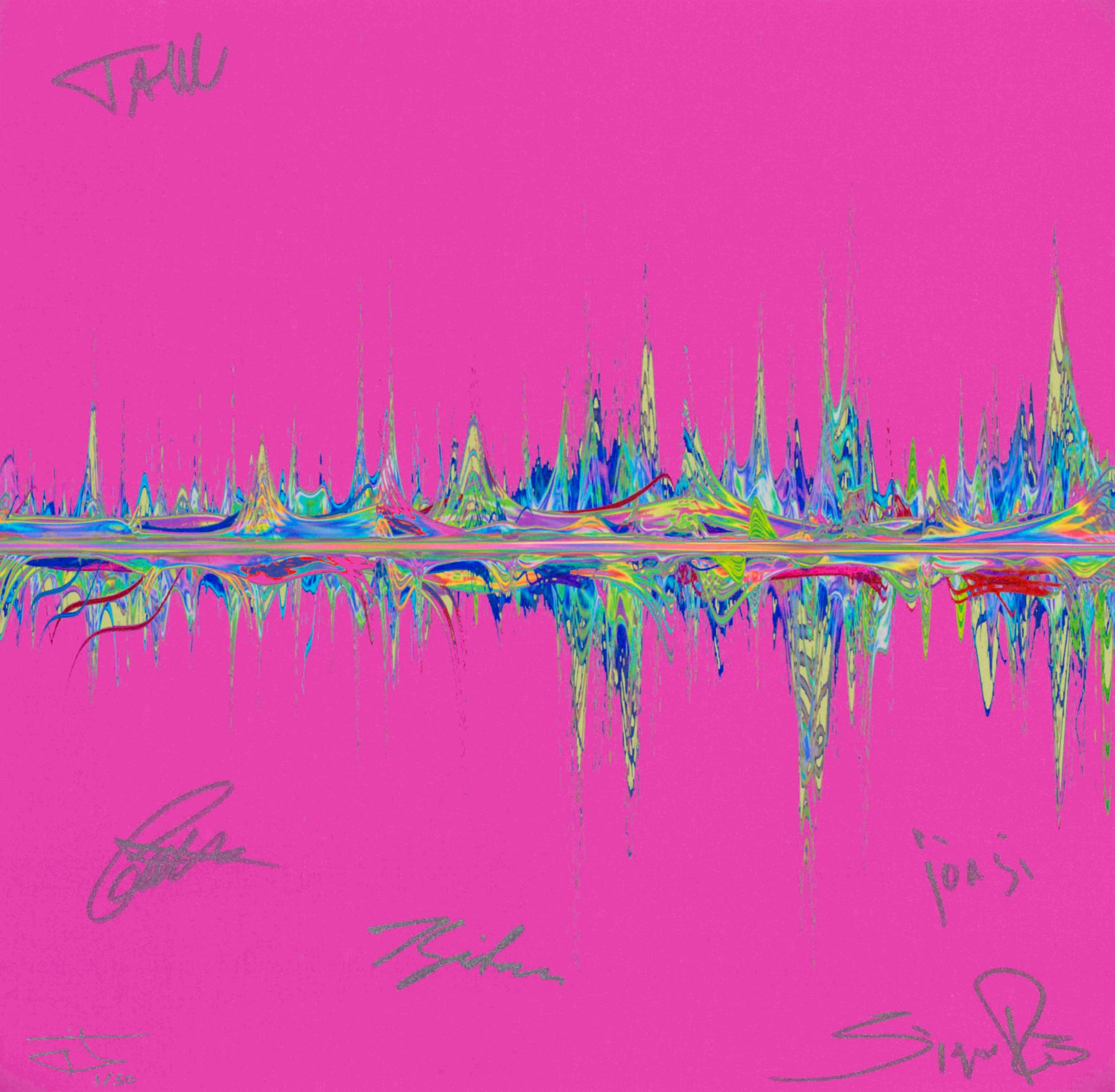 Limited-edition Soundwaves Artwork created from the sound waves of Sigur Rós' "Hoppípolla." The band kindly signed this piece backstage at their May 24, 2022 show at ACL Live in Austin, TX. The band also wrote "Takk" ("Thanks" in Icelandic) across the top and "Sigur Ros" in the bottom corner of this artwork.