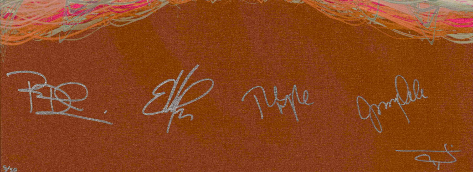 Limited edition Soundwaves Artwork created from the audio recording of The Mavericks' "Dance The Night Away." Raul Malo, Paul Deakin, Jerry Dale McFadden and Eddie Perez signed this print at Gruene Hall in New Braunfels, Texas on December 30, 2022.