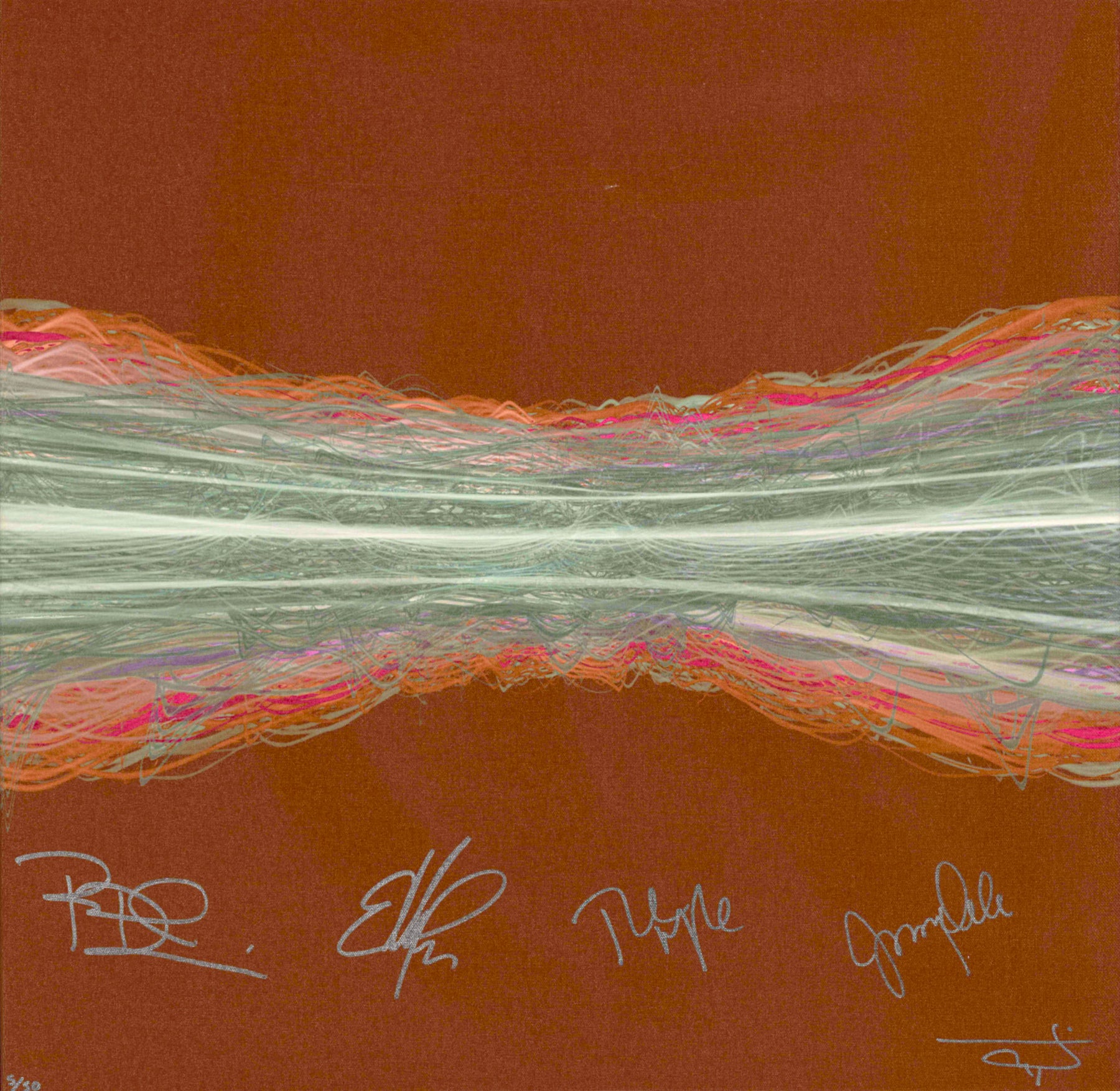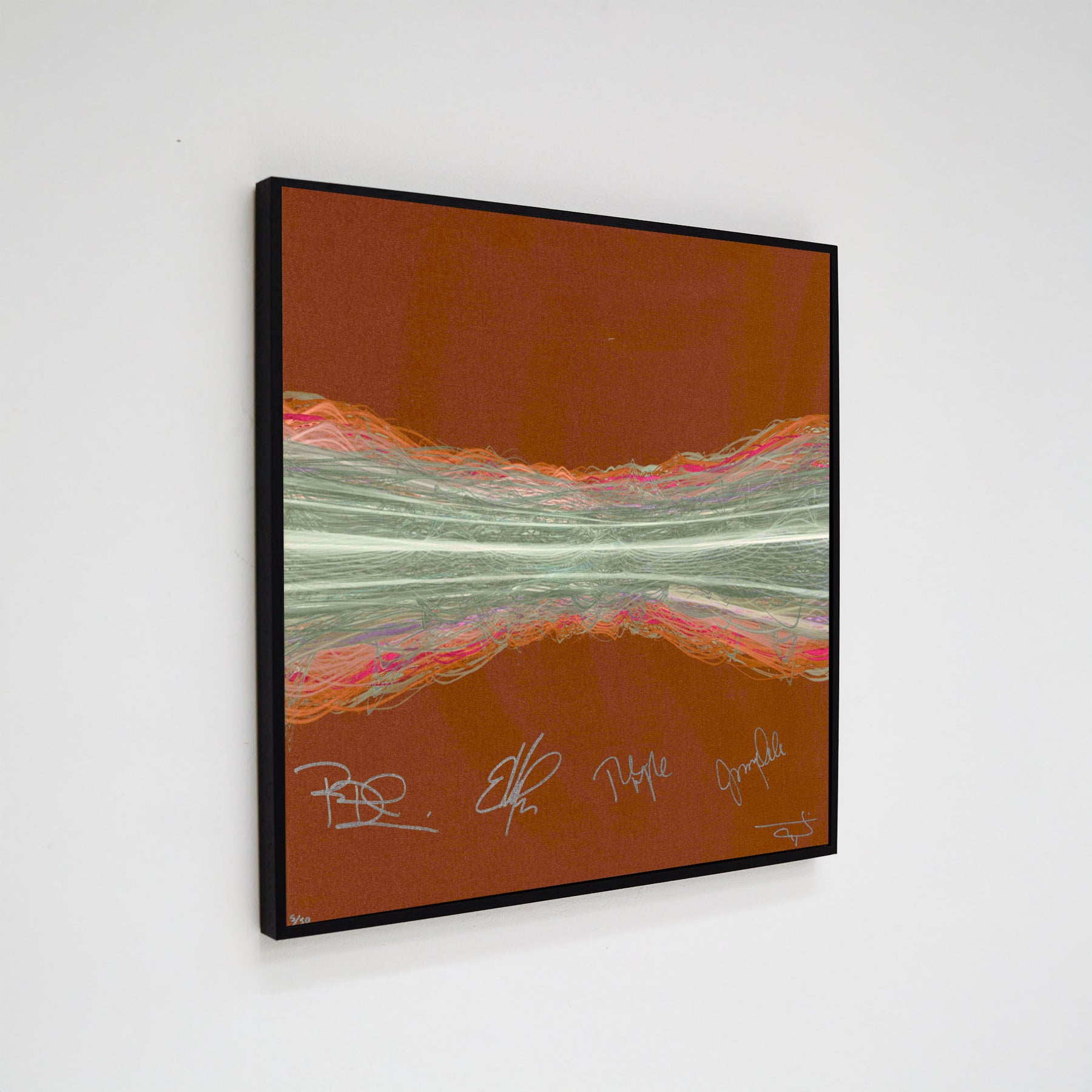 Our Originals measure 38″ x 38″ and often feature a lyric or the title of the song written by the artist in addition to their signature. These are much more limited edition – there is only one Original created per design. Originals sometimes come in alternate color palettes or wave designs to the prints.