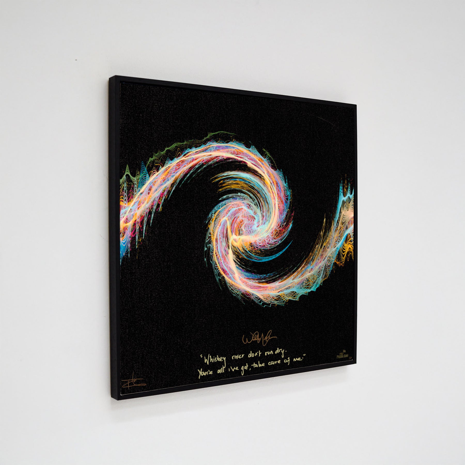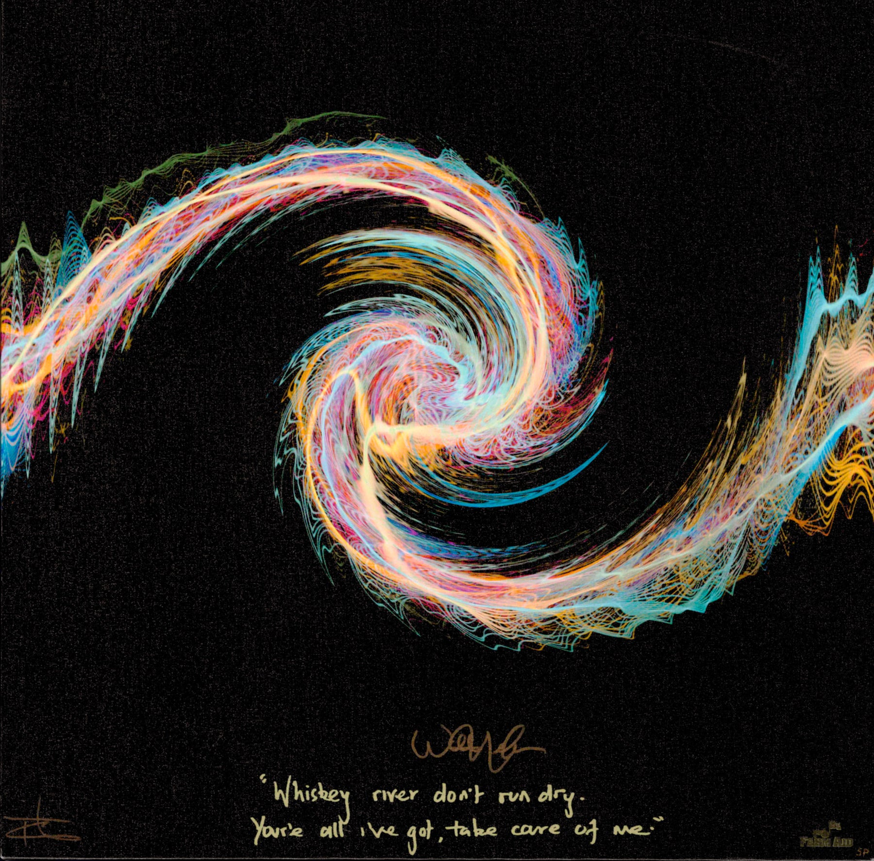 Limited edition Soundwaves Artwork created from the audio of Willie Nelson's 1973 song, "Whiskey River." Willie signed this print at his home in Hawaii in June 2021.