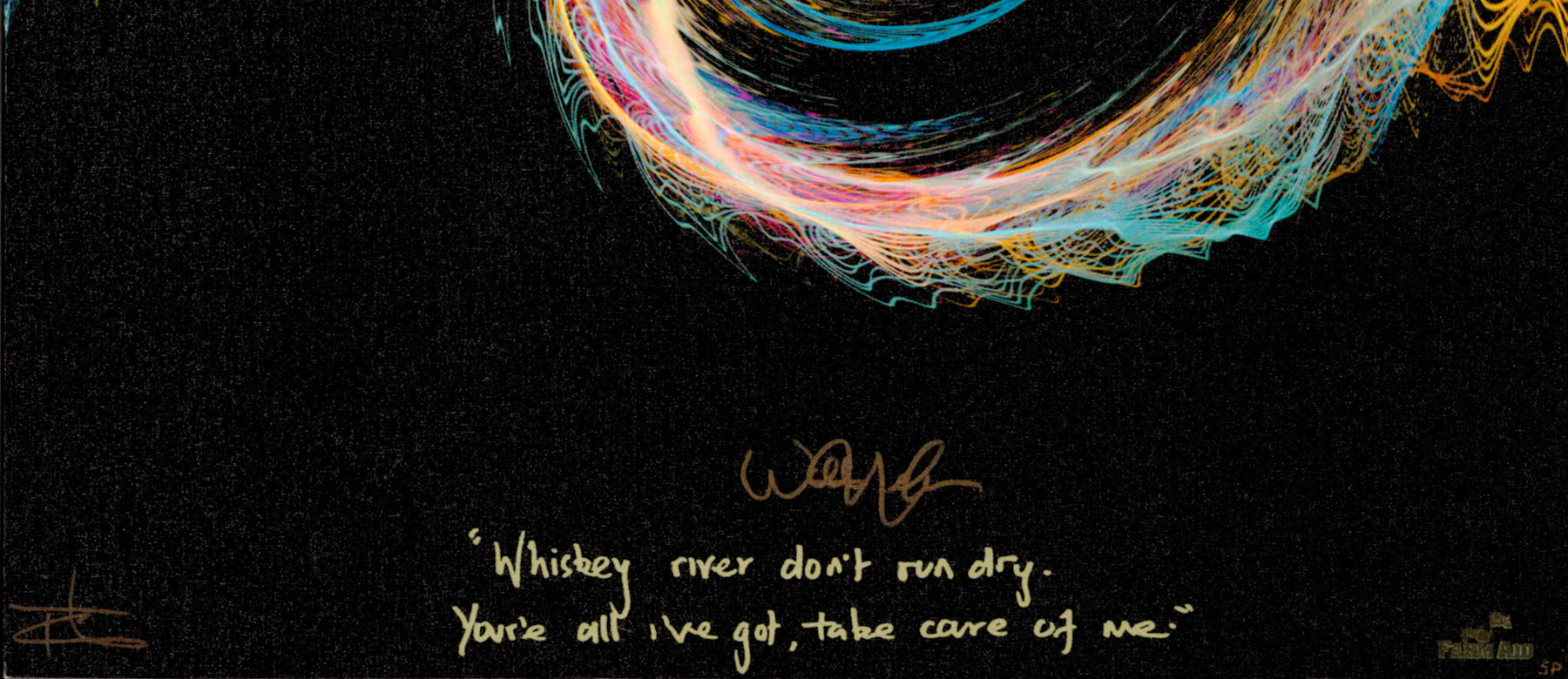 This print features the lyric “Whiskey river don’t run dry, you’re all I’ve got, take care of me” written by Tim and printed onto the artwork.