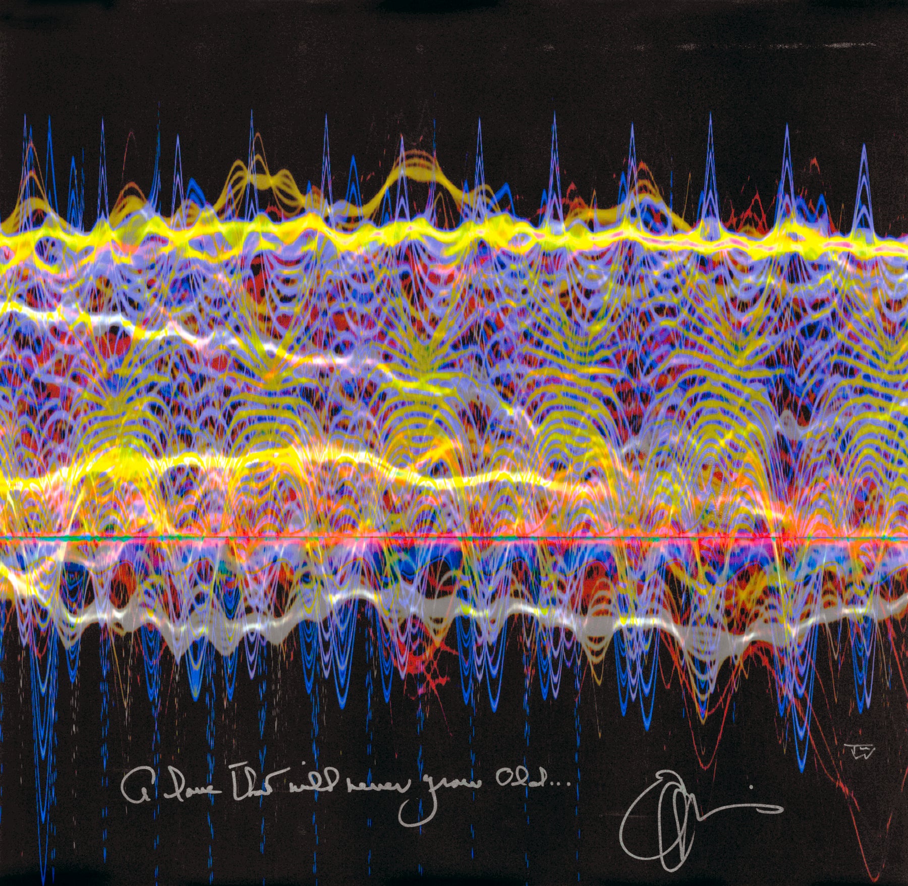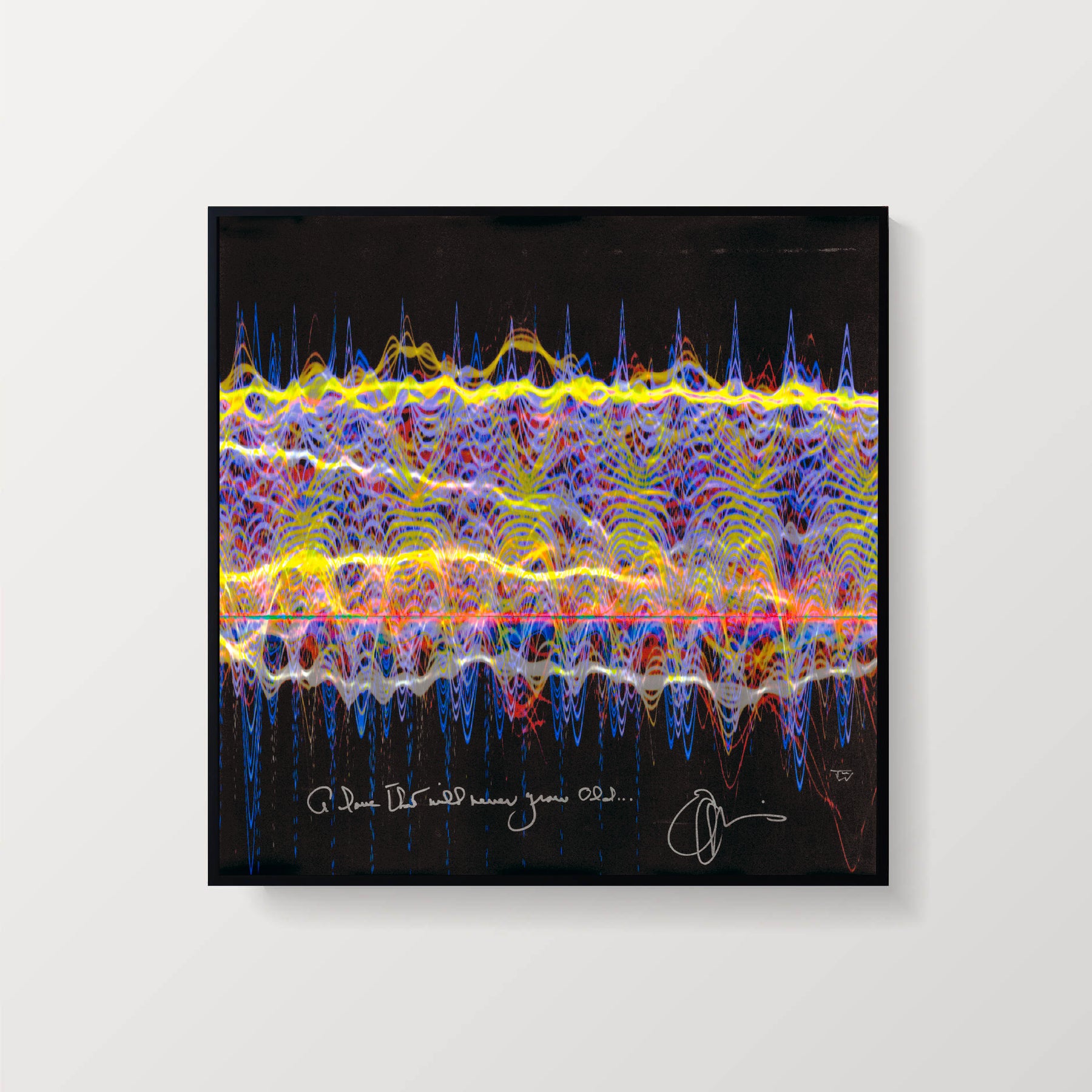 Each signed print measures 24″ x 24″ and is hand signed by the musician. They are part of a larger run of prints, typically with 50-100 copies signed in total. Our unsigned prints, which come in a standard and a mini size, feature the same design as the signed print, but do not have the musician's autograph. They are still limited edition and are signed by Soundwaves Art creator, Tim Wakefield.