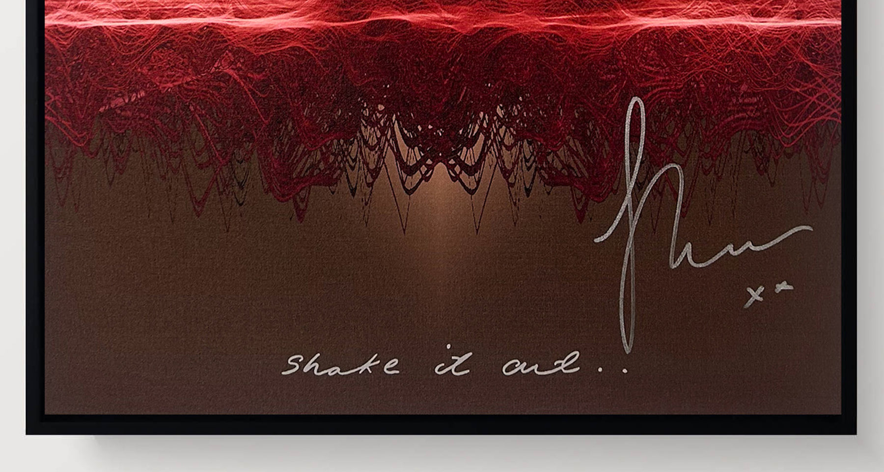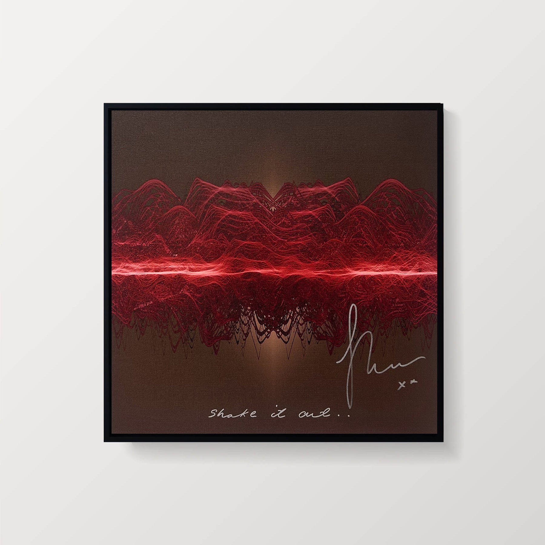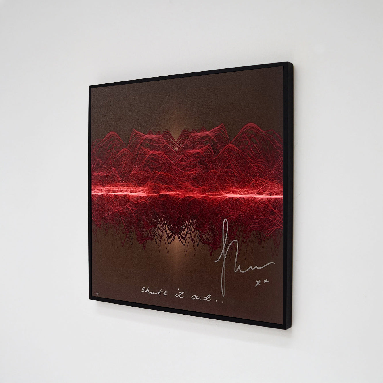 Our Originals measure 38″ x 38″ and often feature a lyric or the title of the song written by the artist in addition to their signature. These are much more limited edition – there is only one Original created per design. Originals sometimes come in alternate color palettes or wave designs to the prints.