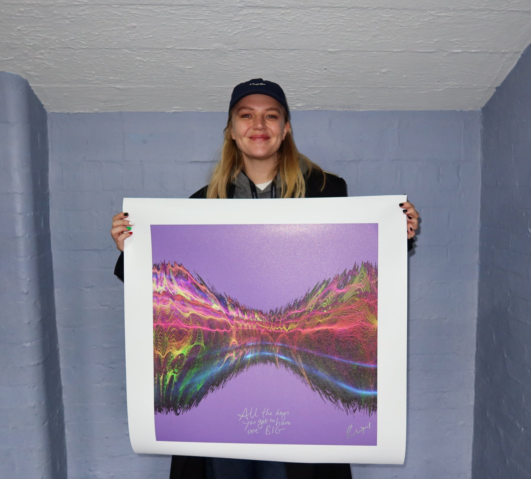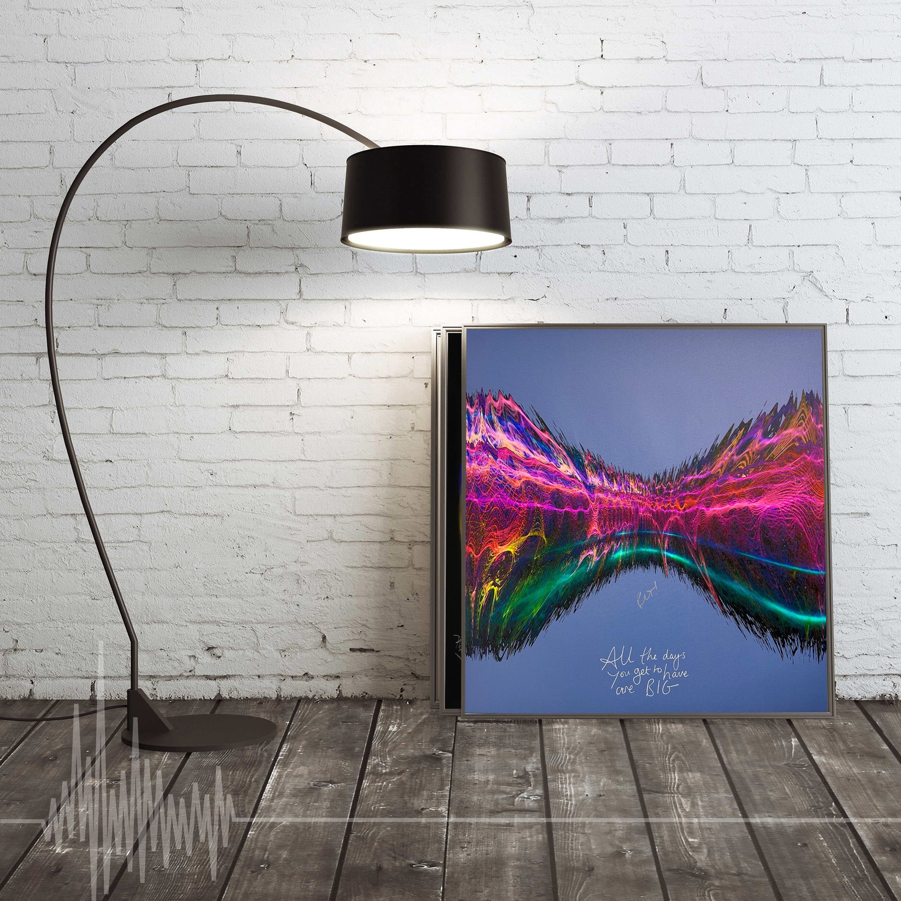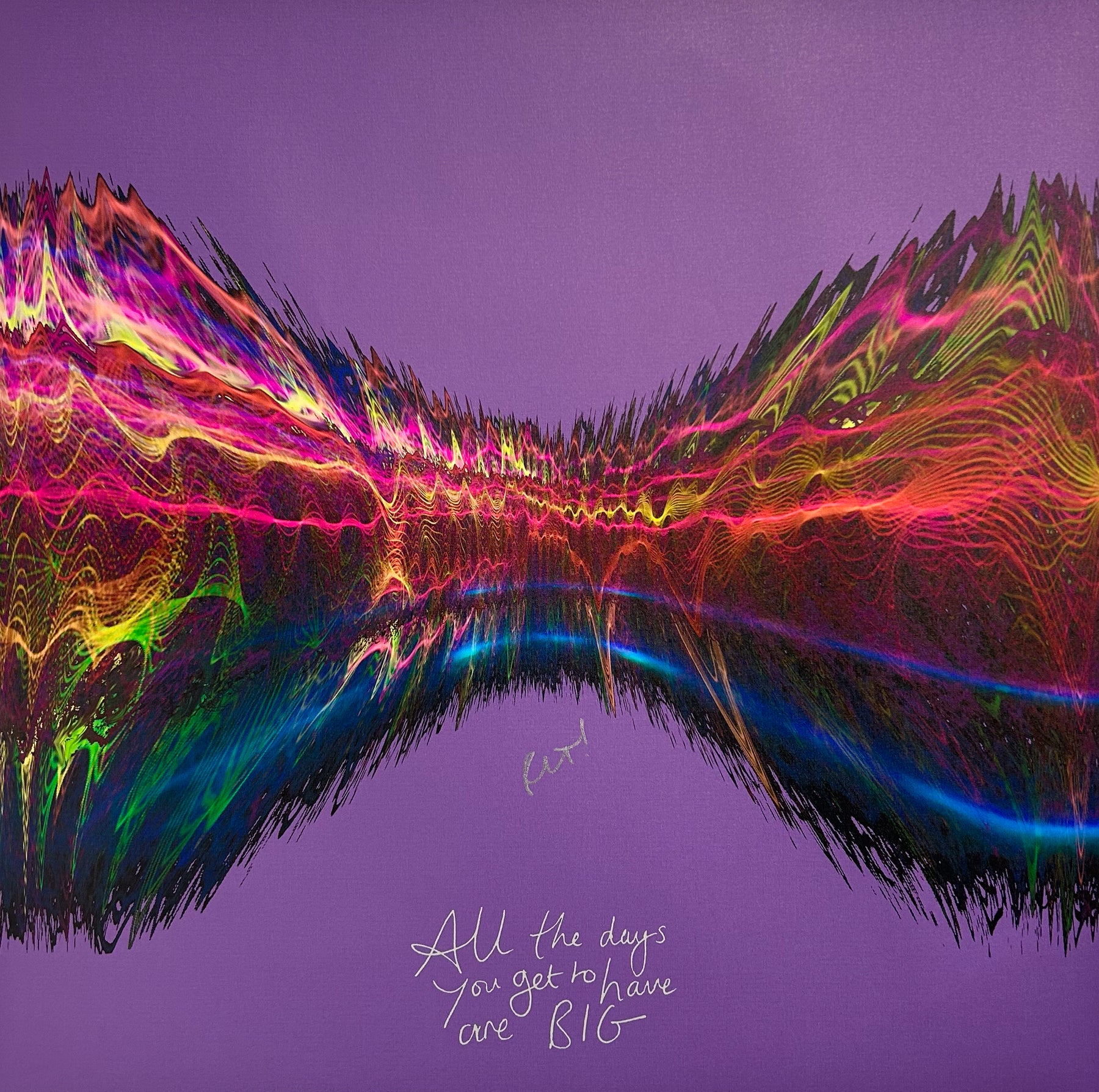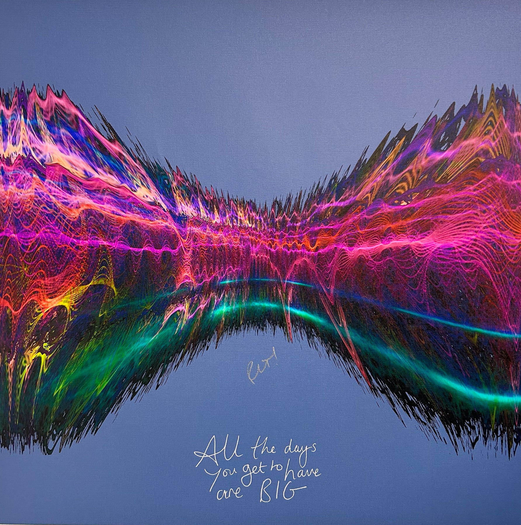 Our Originals measure 38″ x 38″ and often feature a lyric or the title of the song written by the artist in addition to their signature. These are much more limited edition – there is only one Original created per design. Originals sometimes come in alternate color palettes or wave designs to the prints.