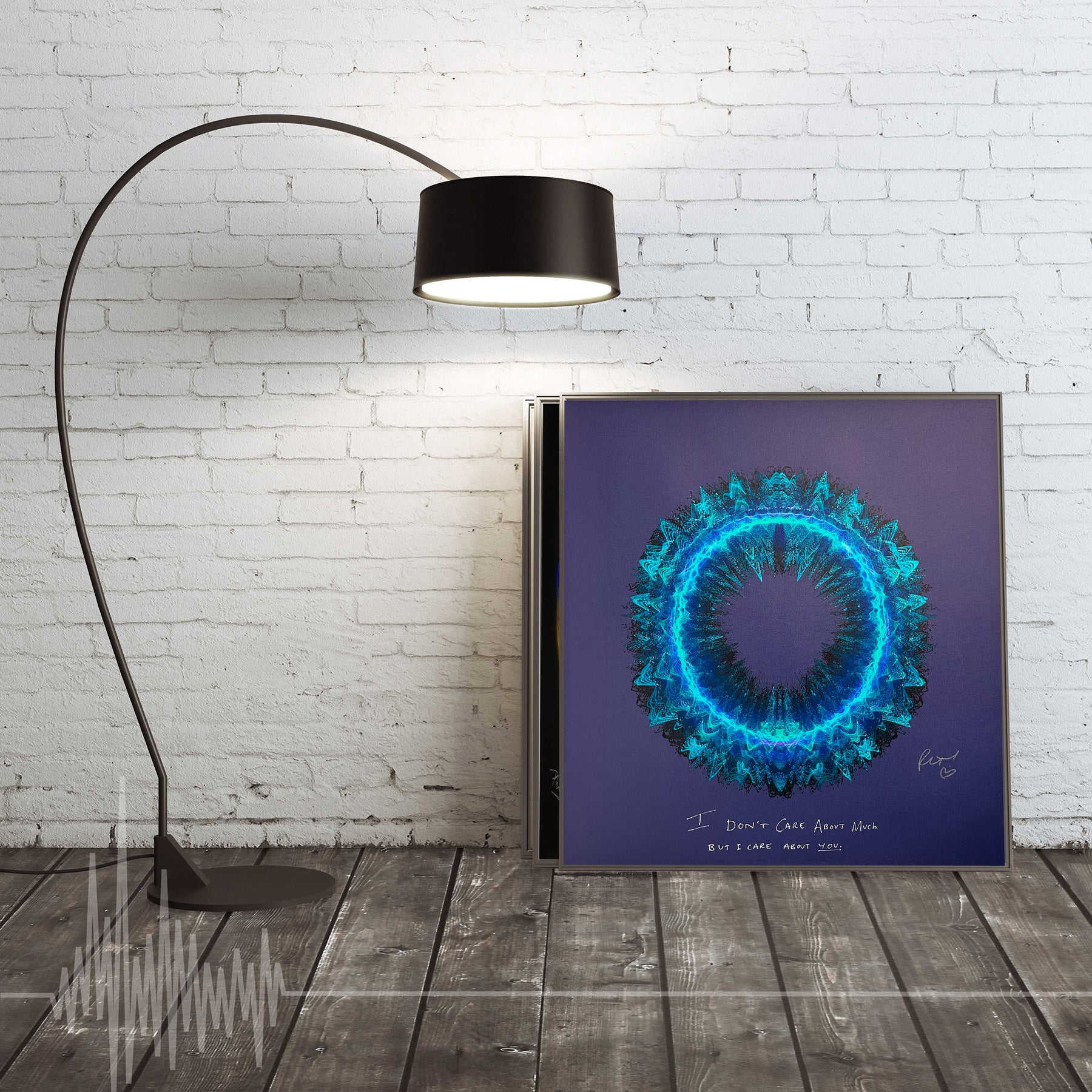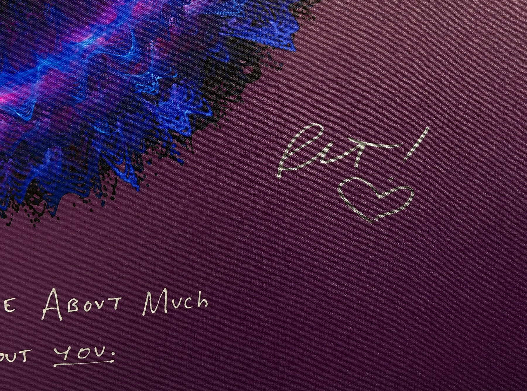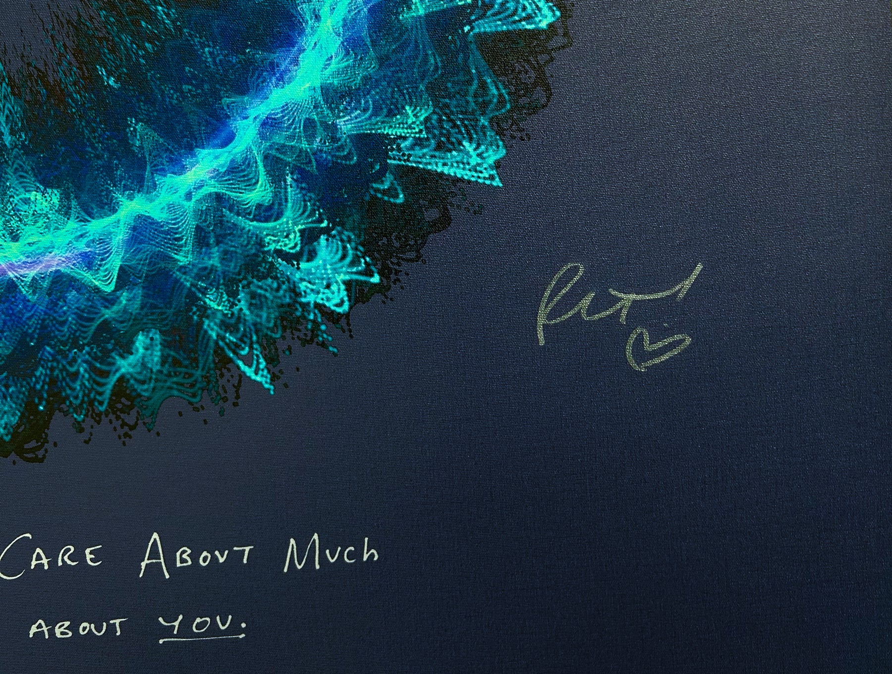 Our Originals measure 38″ x 38″ and often feature a lyric or the title of the song written by the artist in addition to their signature. These are much more limited edition – there is only one Original created per design. Originals sometimes come in alternate color palettes or wave designs to the prints.