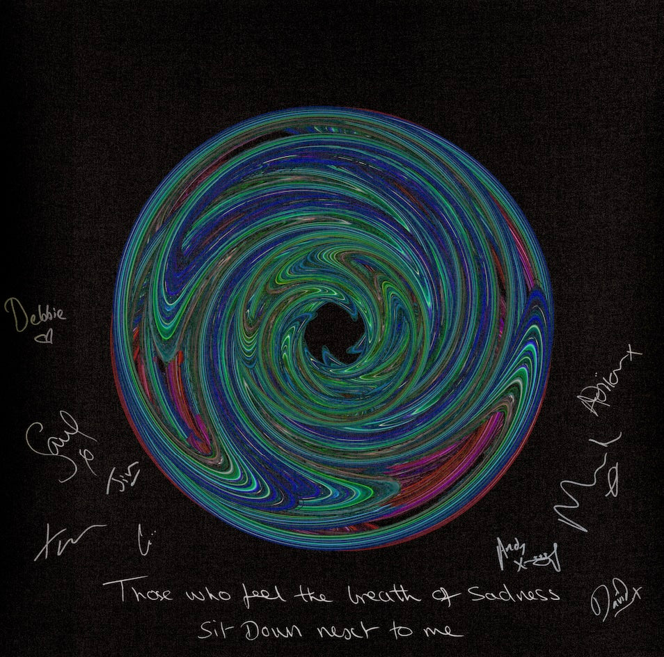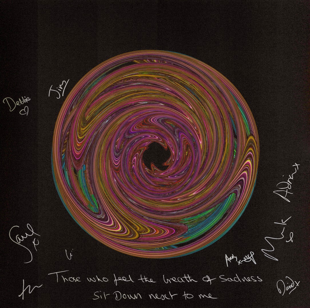 Each artwork features a handwritten lyric by Tim Booth that has been digitally added to the artwork "Those who feel the breath of sadness sit down next to me"
