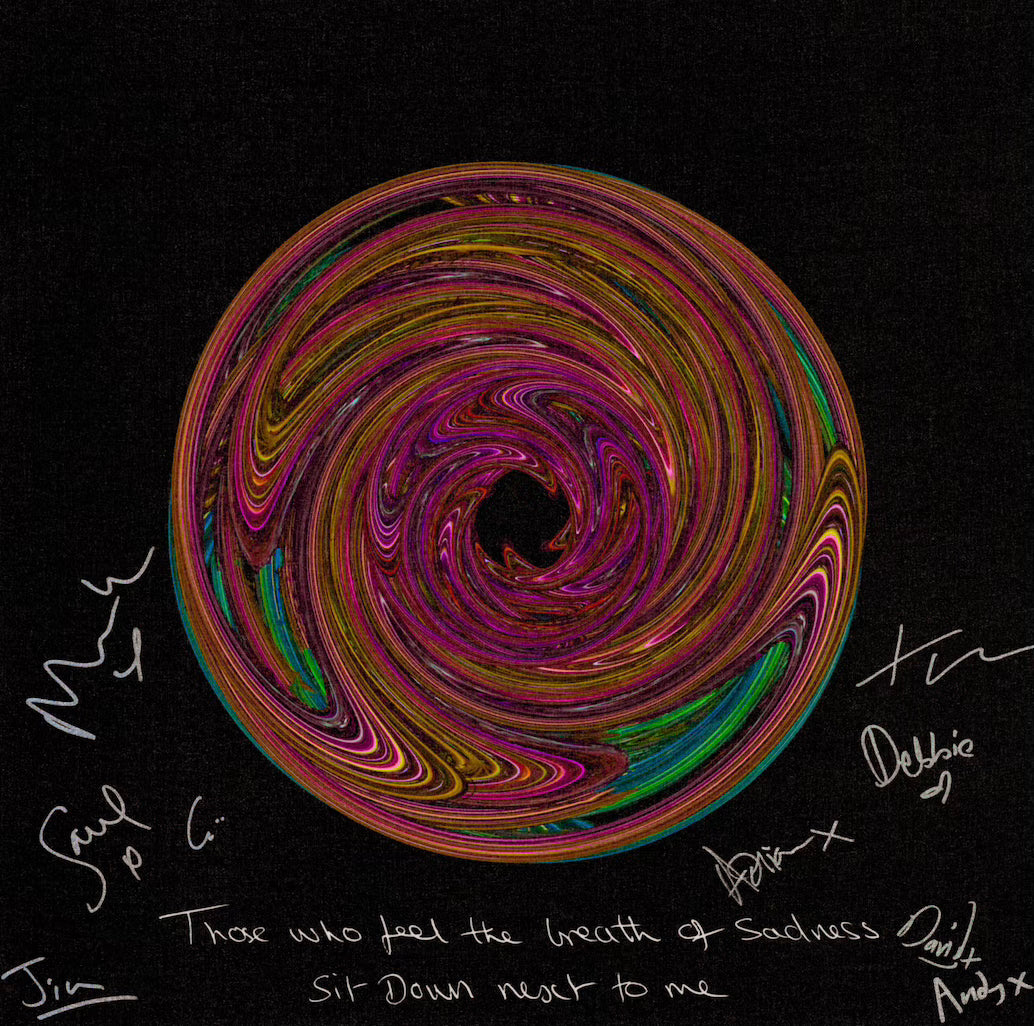 Each artwork features a handwritten lyric by Tim Booth that has been digitally added to the artwork "Those who feel the breath of sadness sit down next to me"
