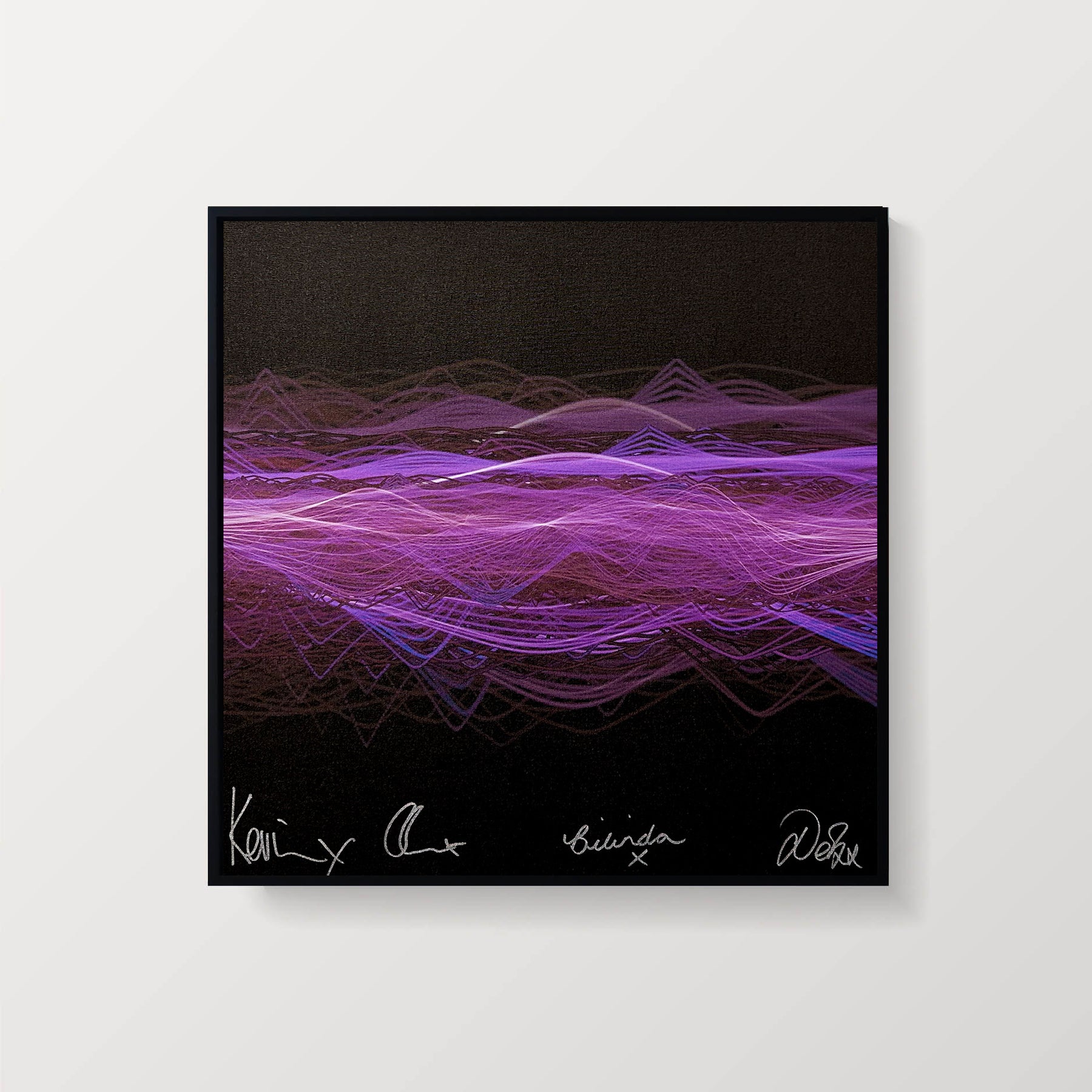 Our Originals measure 38″ x 38″ and often feature a lyric or the title of the song written by the artist in addition to their signature. These are much more limited edition – there is only one Original created per design. Originals sometimes come in alternate color palettes or wave designs to the prints.