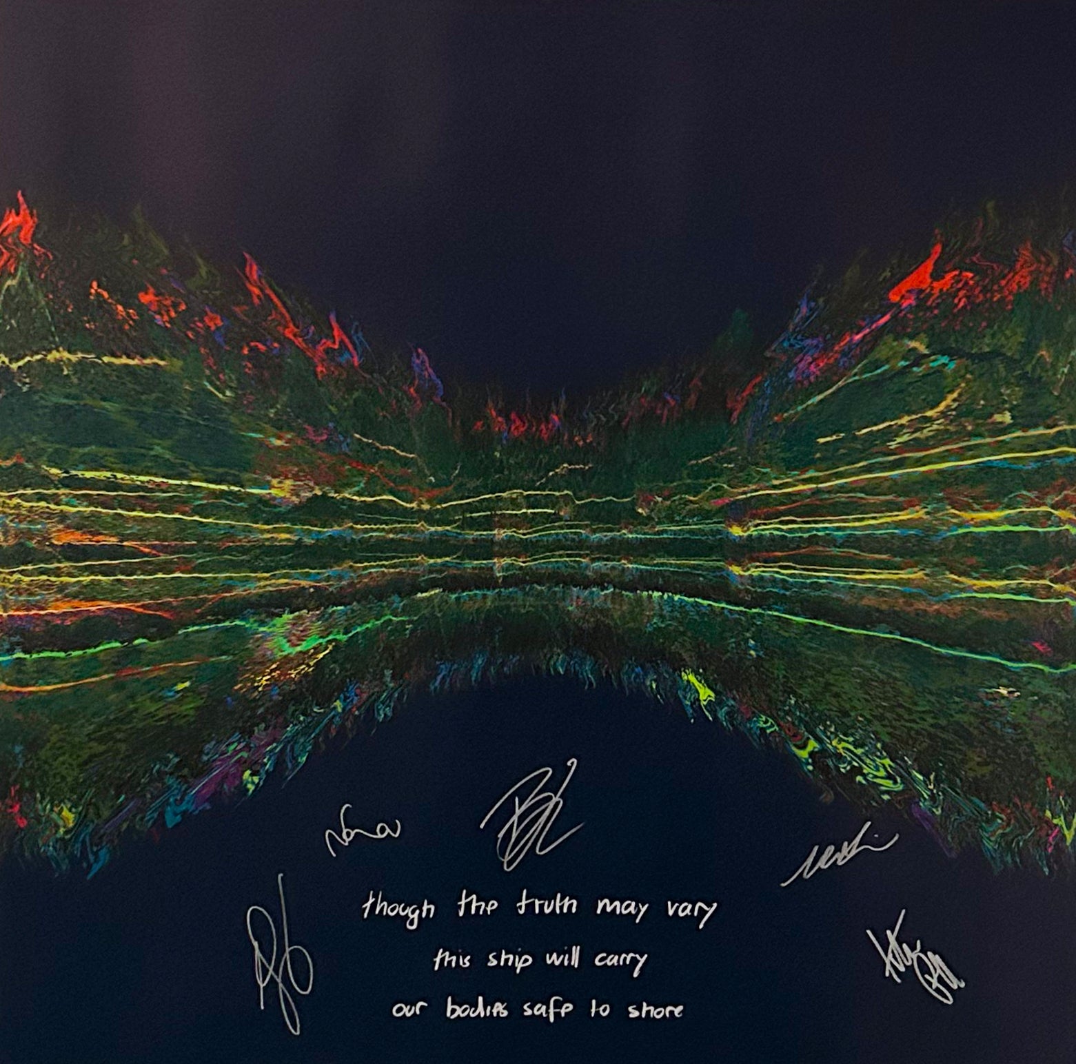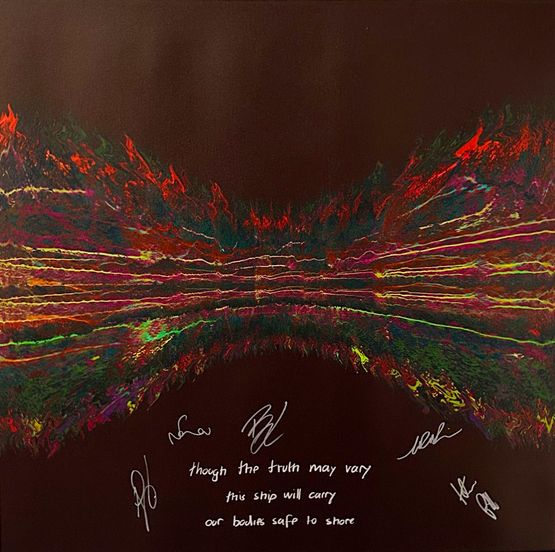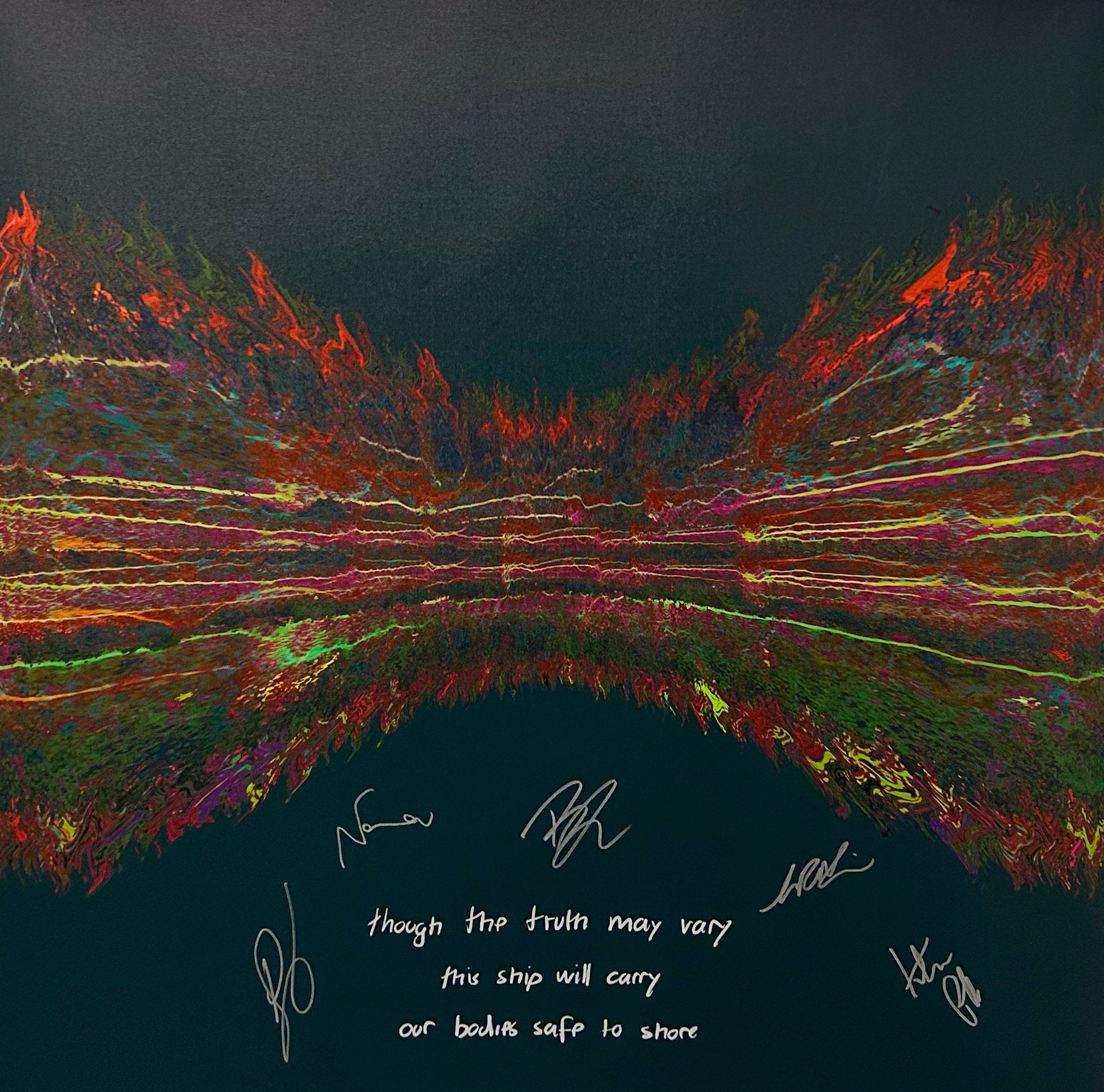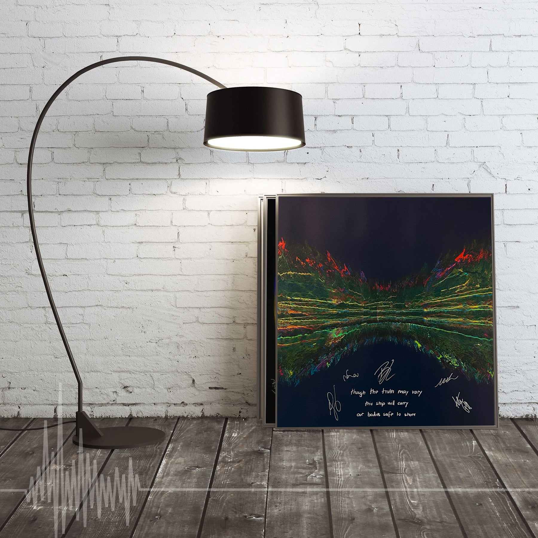 Our Originals measure 38″ x 38″ and often feature a lyric or the title of the song written by the artist in addition to their signature. These are much more limited edition – there is only one Original created per design. Originals sometimes come in alternate color palettes or wave designs to the prints.