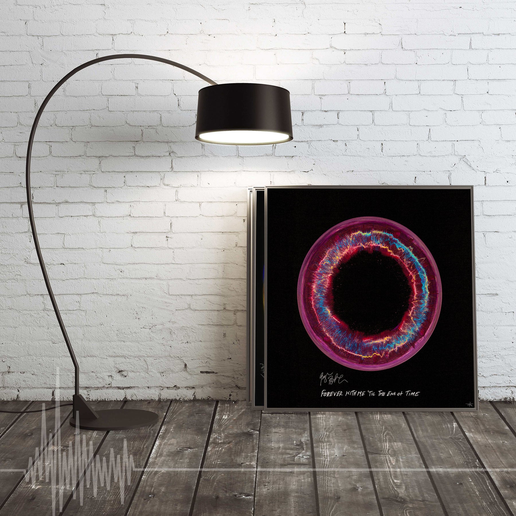 Our Originals measure 38″ x 38″ and often feature a lyric or the title of the song written by the artist in addition to their signature. These are much more limited edition – there is only one Original created per design. Originals sometimes come in alternate color palettes or wave designs to the prints.