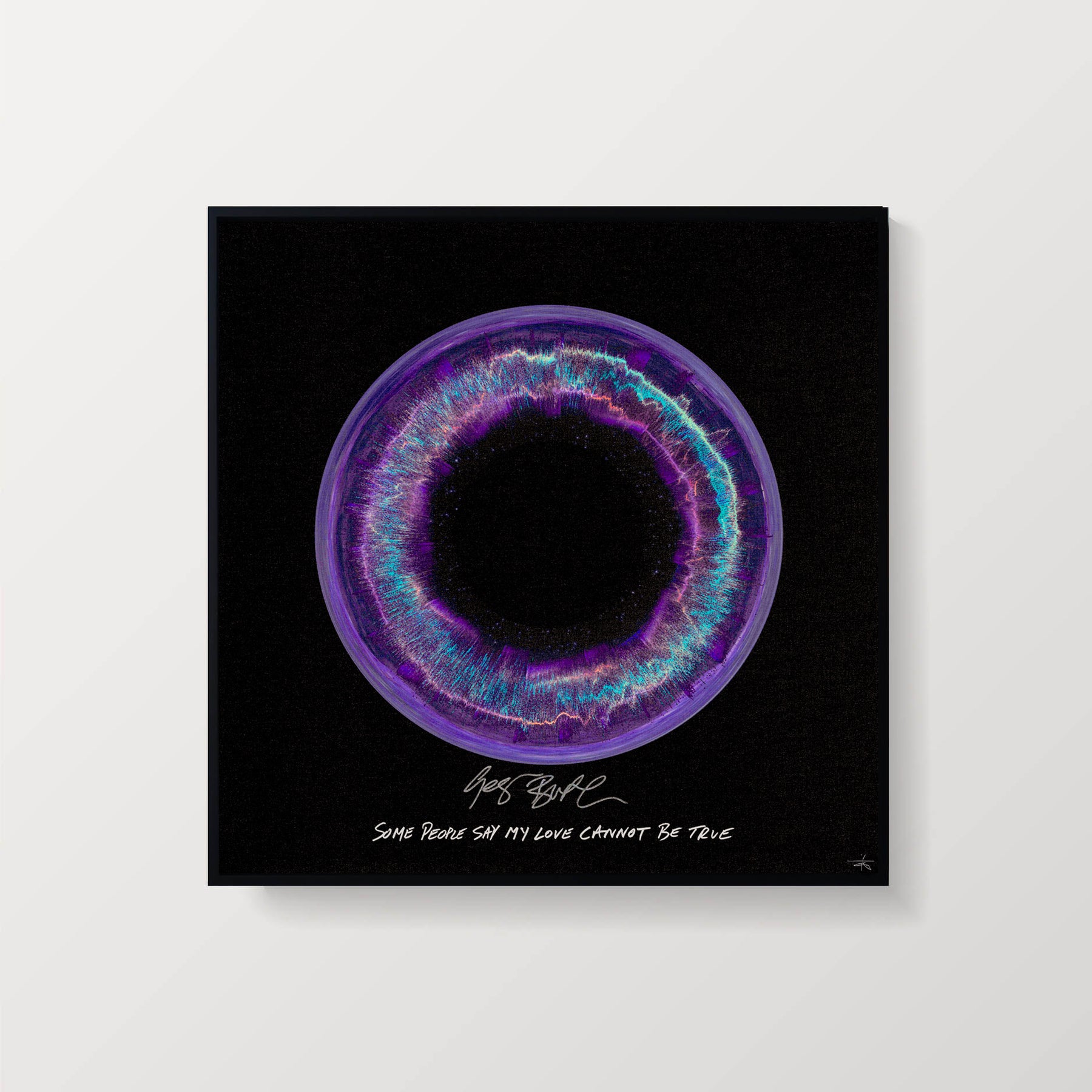 Our Originals measure 38″ x 38″ and often feature a lyric or the title of the song written by the artist in addition to their signature. These are much more limited edition – there is only one Original created per design. Originals sometimes come in alternate color palettes or wave designs to the prints.