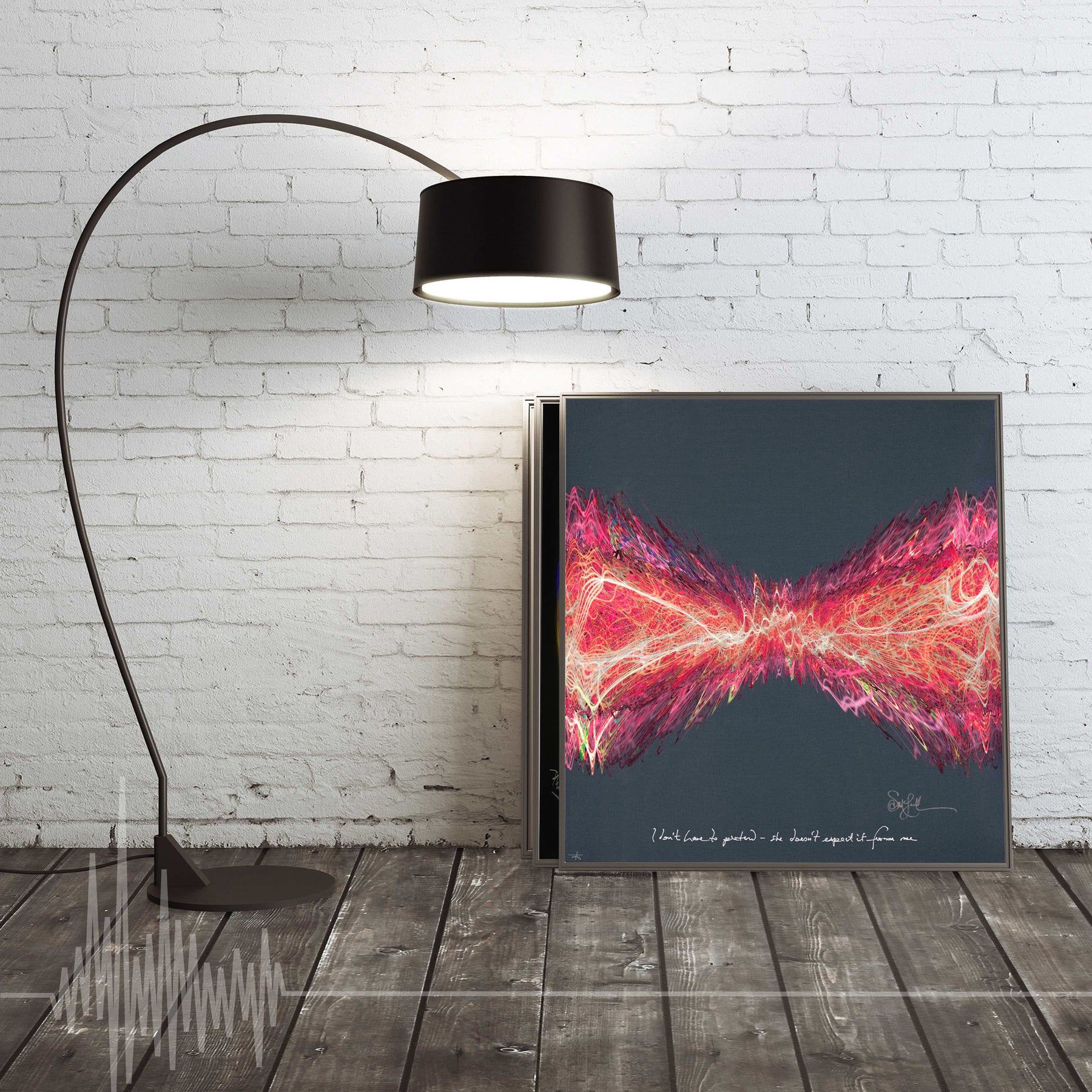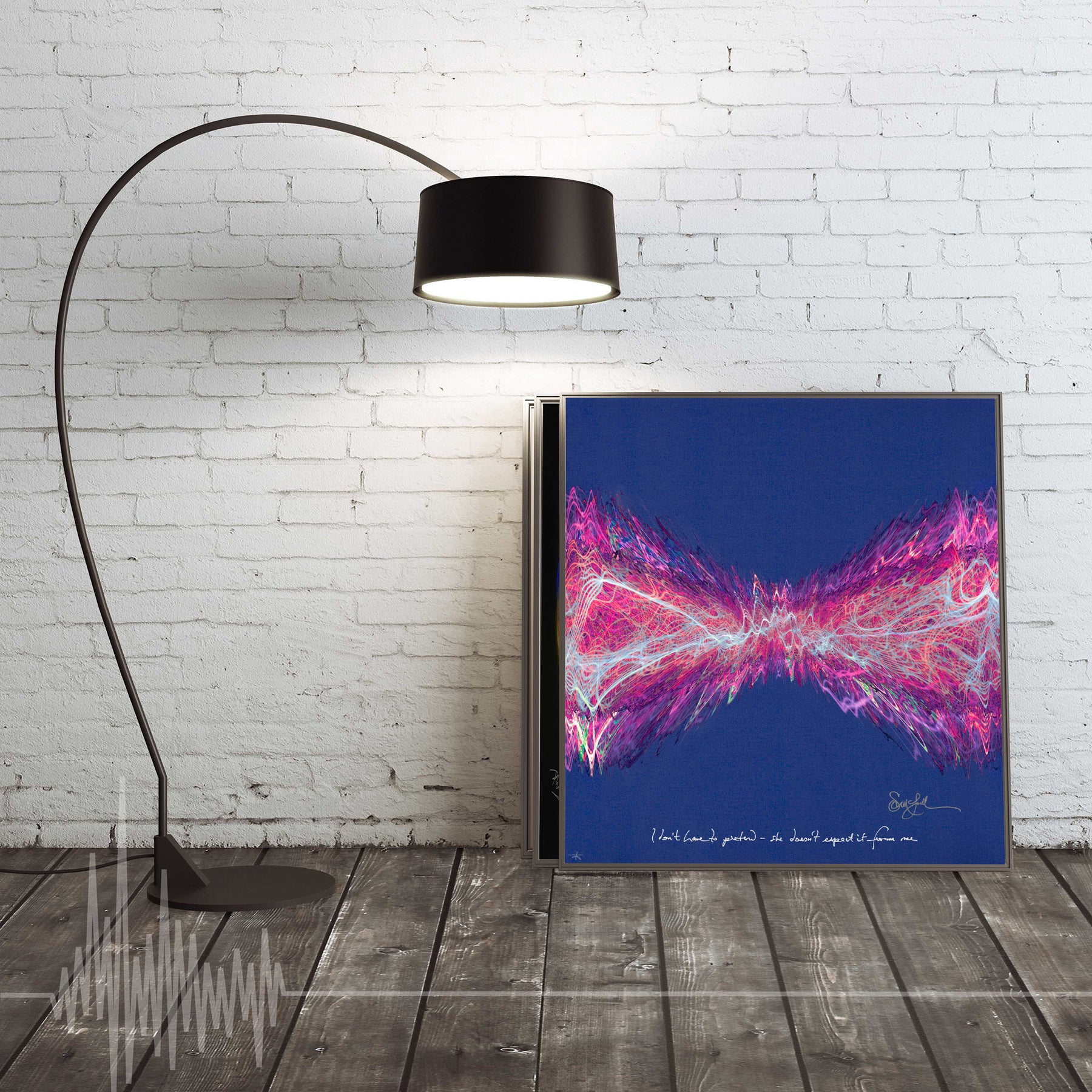 Our Originals measure 38″ x 38″ and often feature a lyric or the title of the song written by the artist in addition to their signature. These are much more limited edition – there is only one Original created per design. Originals sometimes come in alternate color palettes or wave designs to the prints.