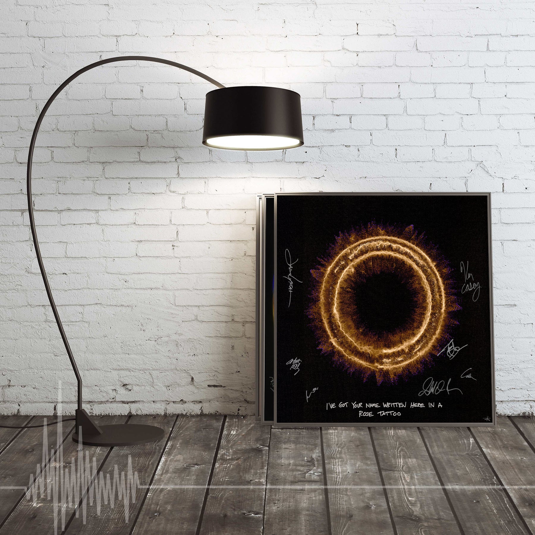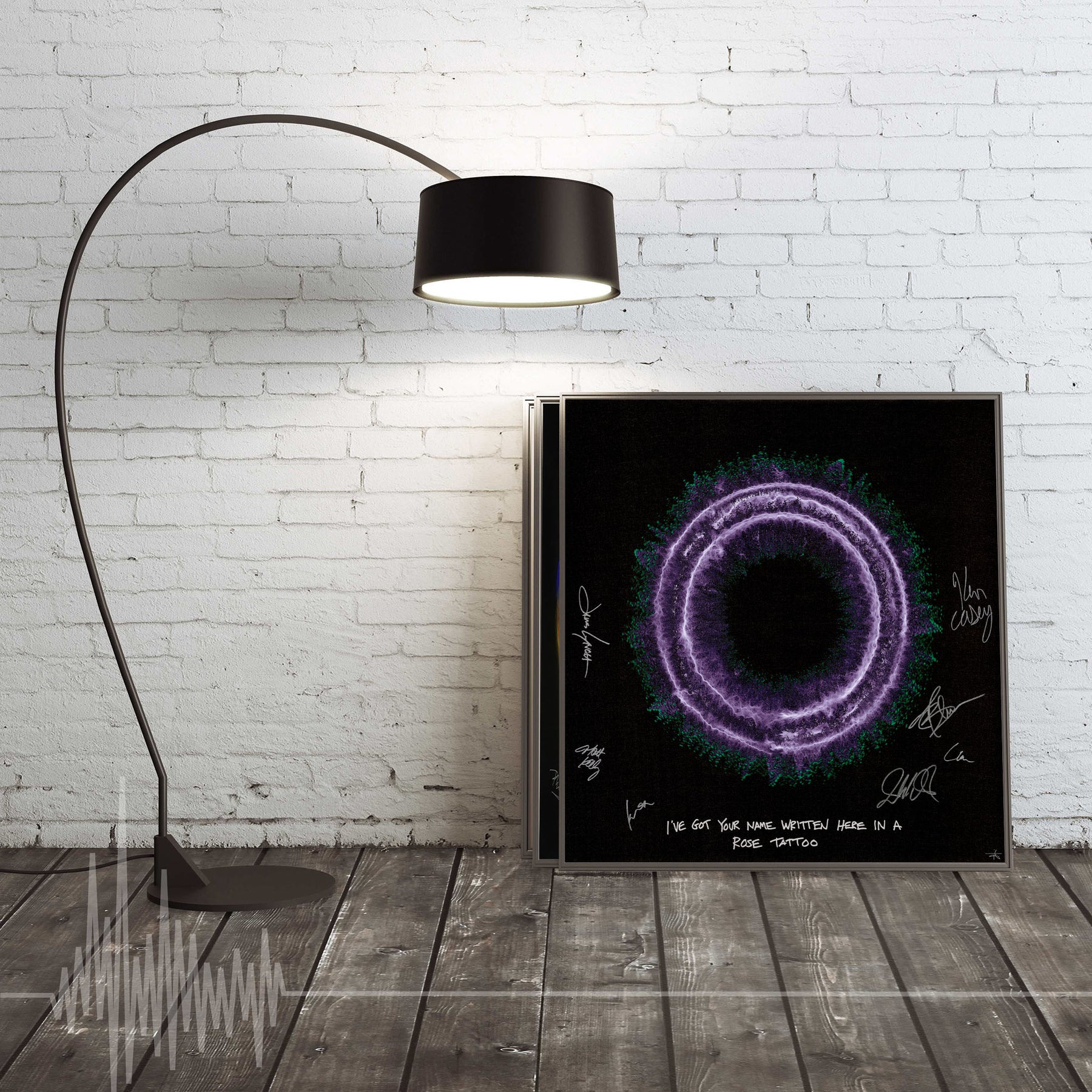 Each signed print measures 24″ x 24″ and is hand signed by the musician. They are part of a larger run of prints, typically with 50-100 copies signed in total. Our unsigned prints, which come in a standard and a mini size, feature the same design as the signed print, but do not have the musician's autograph. They are still limited edition and are signed by Soundwaves Art creator, Tim Wakefield.