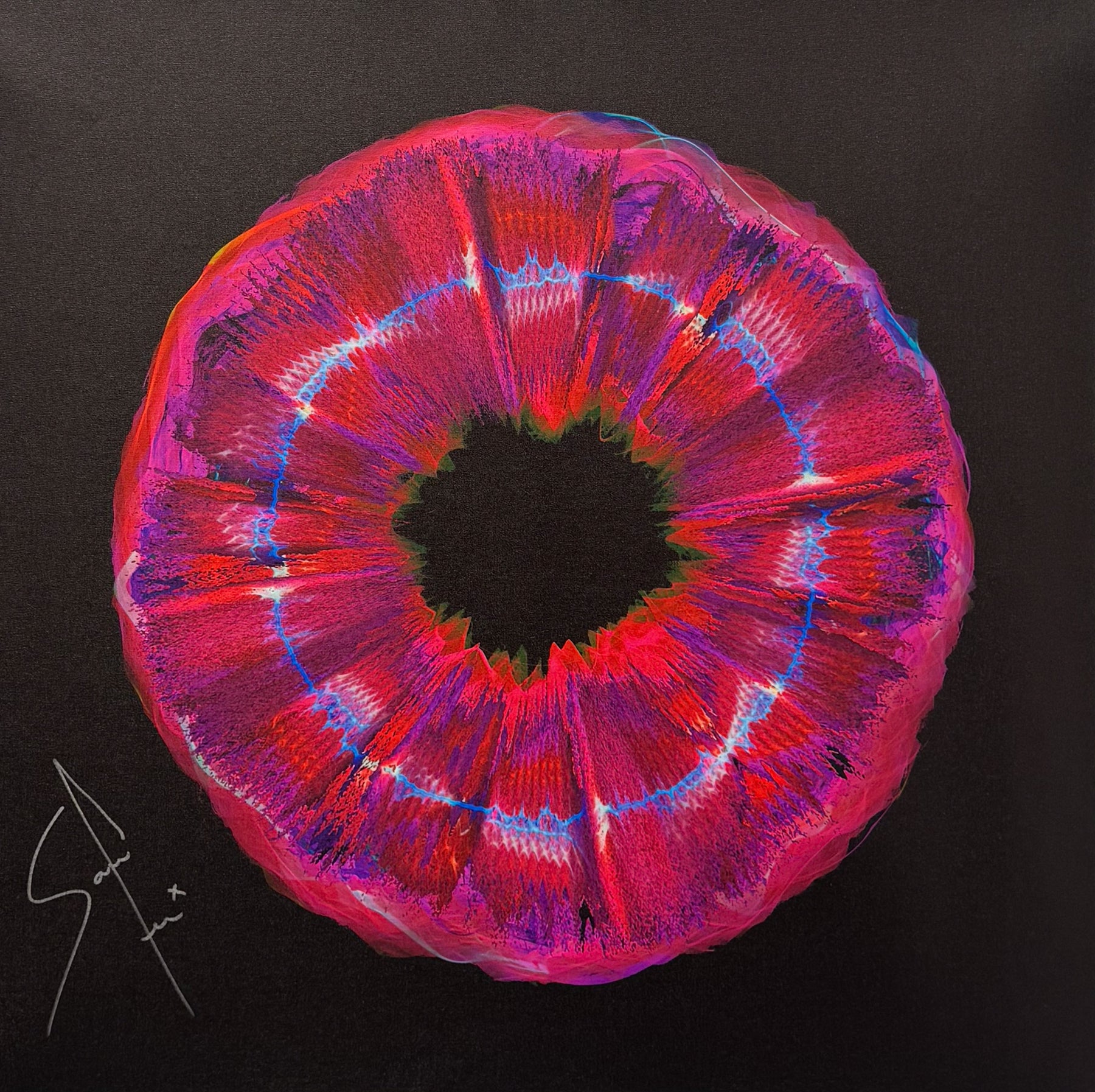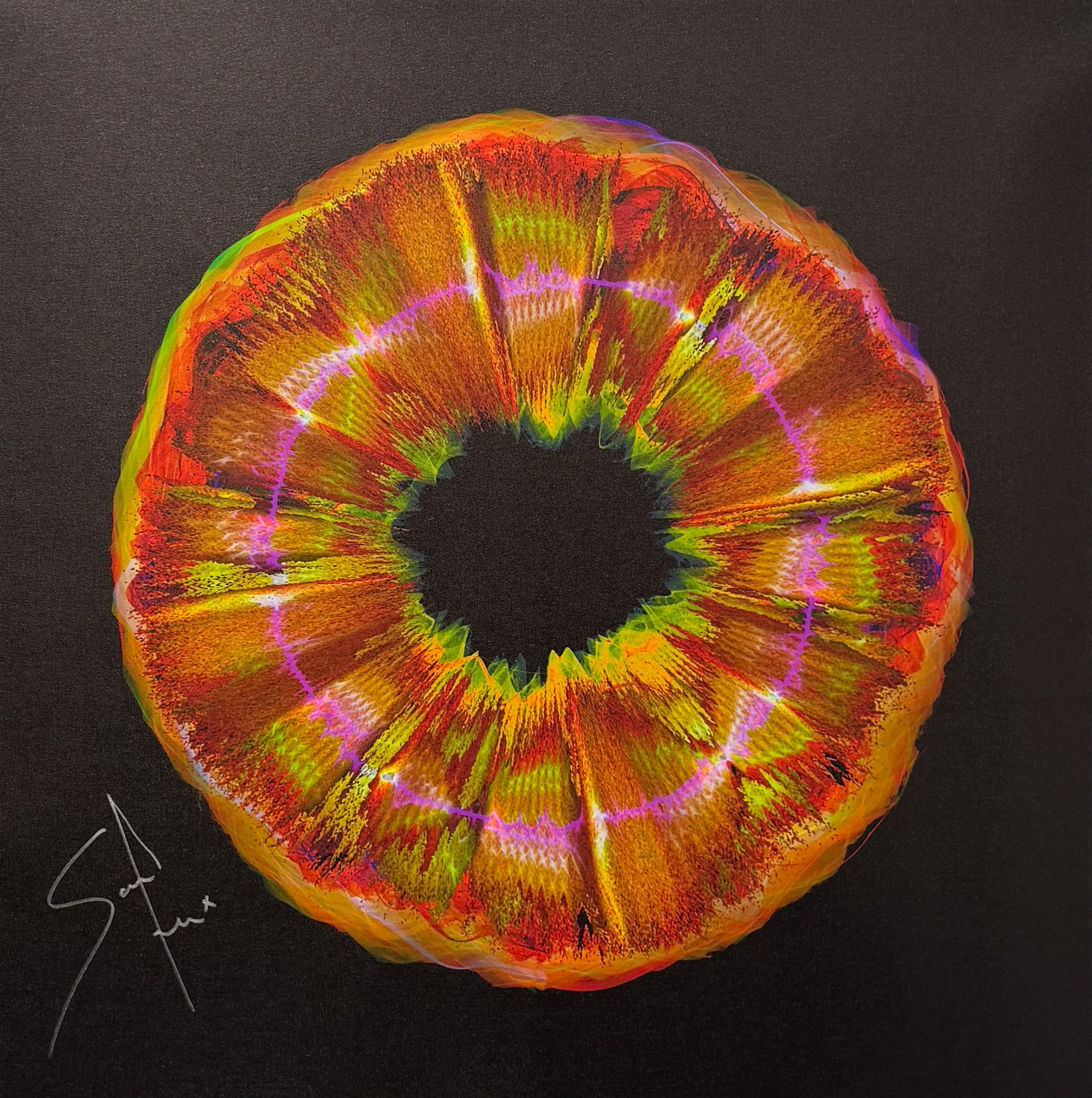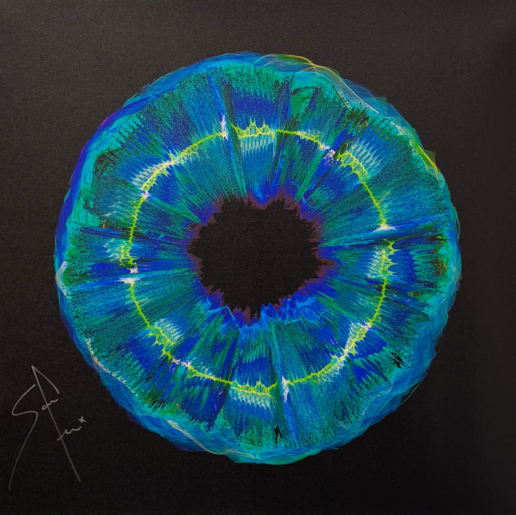 Our Originals measure 38″ x 38″ and often feature a lyric or the title of the song written by the artist in addition to their signature. These are much more limited edition – there is only one Original created per design. Originals sometimes come in alternate color palettes or wave designs to the prints.