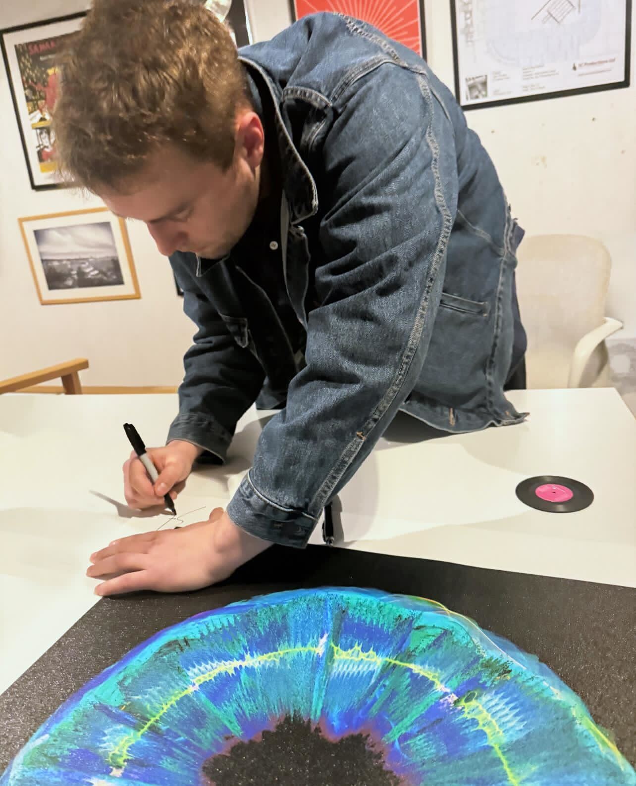 Each signed print measures 24″ x 24″ and is hand signed by the musician. They are part of a larger run of prints, typically with 50-100 copies signed in total. Our unsigned prints, which come in a standard and a mini size, feature the same design as the signed print, but do not have the musician's autograph. They are still limited edition and are signed by Soundwaves Art creator, Tim Wakefield.