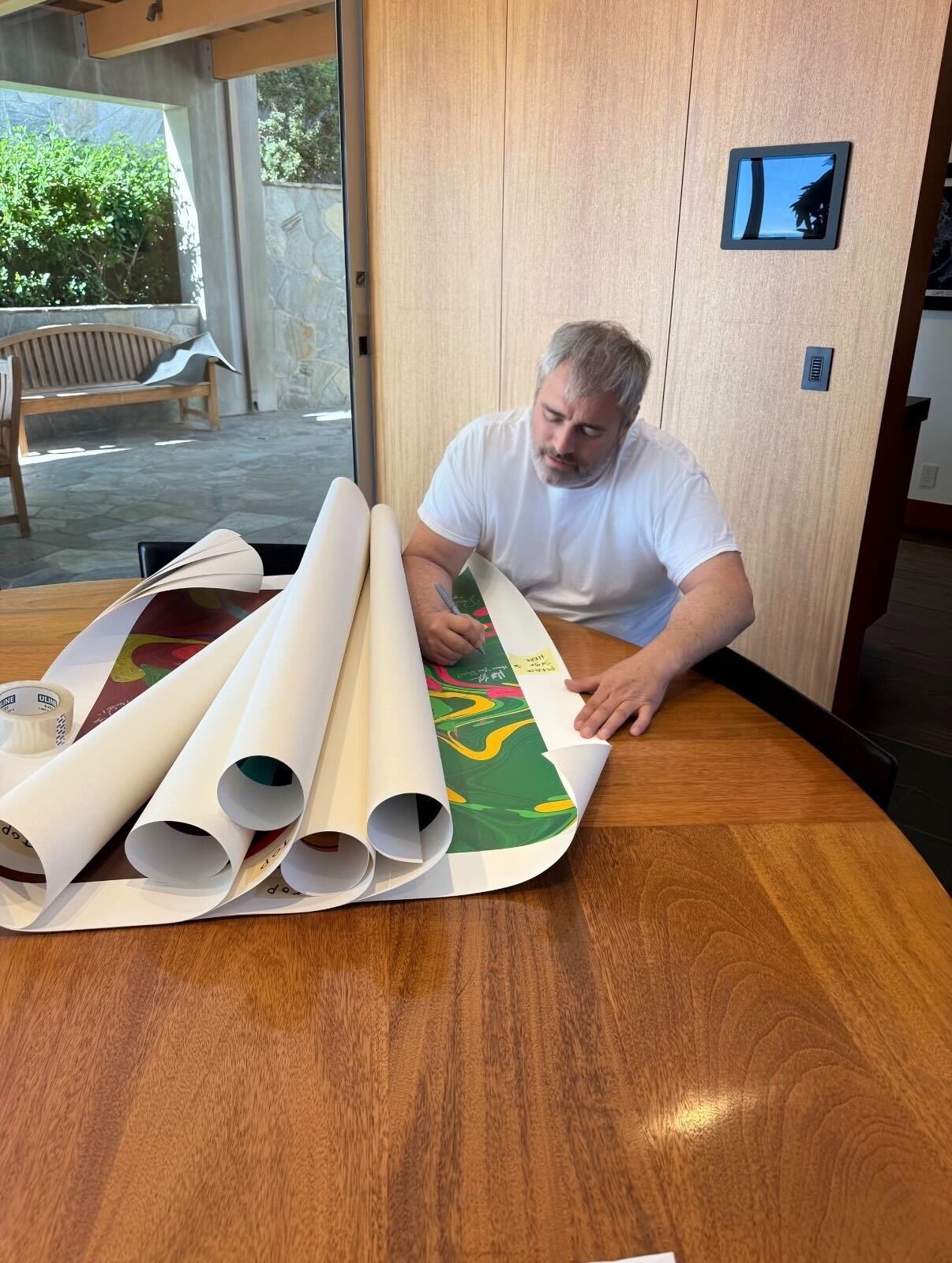 Our Originals measure 38″ x 38″ and often feature a lyric or the title of the song written by the artist in addition to their signature. These are much more limited edition – there is only one Original created per design. Originals sometimes come in alternate color palettes or wave designs to the prints.